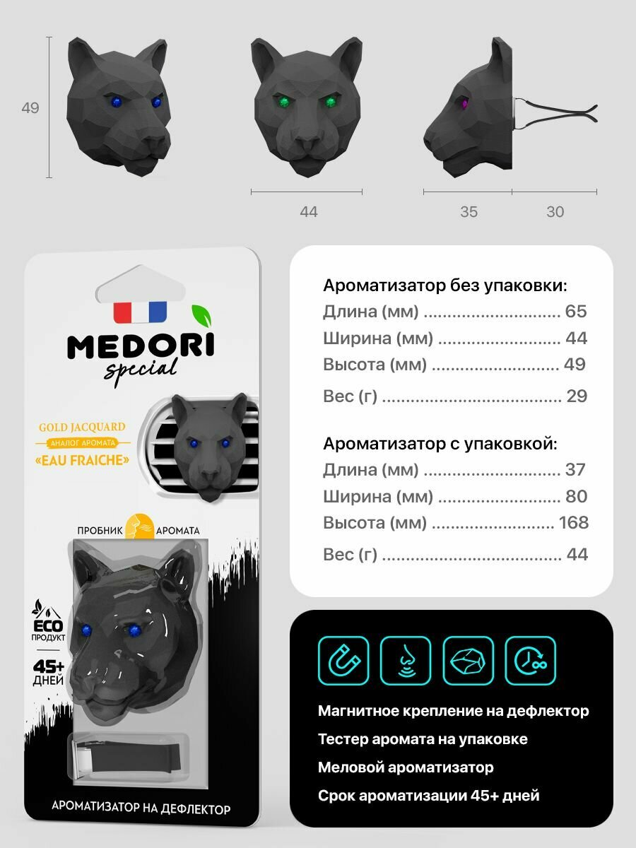 Ниже Вы можете прочитать отзывы на Ароматизатор в машину Medori 3D Gold Jacquar на дефлектор / освежитель автомобильный меловой с магнитным креплением / вонючка cо свежим ароматом, ознакомится с подробными характеристиками, посмотреть интересные обзоры и фотографии на Ароматизатор в машину Medori 3D Gold Jacquar на дефлектор / освежитель автомобильный меловой с магнитным креплением / вонючка cо свежим ароматом.