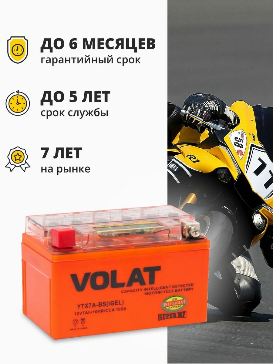 Аккумулятор для мотоцикла 12v Volat YTX7A-BS(iGEL) прямая полярность 7 Ah 105 A гелевый, акб на скутер, мопед, квадроцикл 150x87x94 мм интересное: