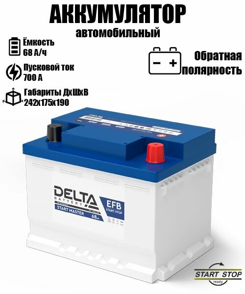 Аккумулятор автомобильный DELTA Start Master EFB 68 А/ч 700 А обр. пол. Евро авто (242x175x190) 1268