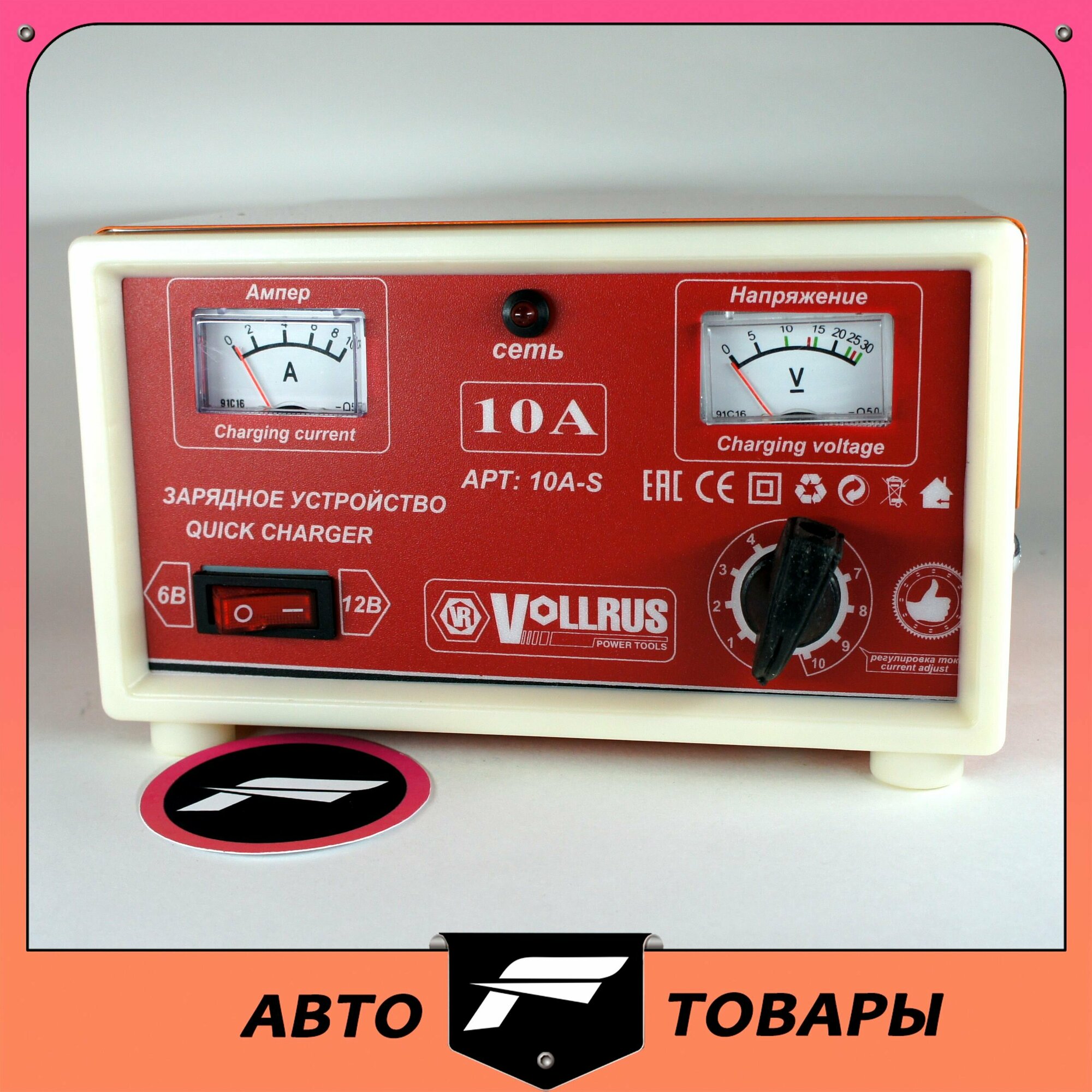 Зарядное устройство для АКБ VOLLRUS 10A-S, 6/12В, с индикатором напряжения,амперметром и регулировкой