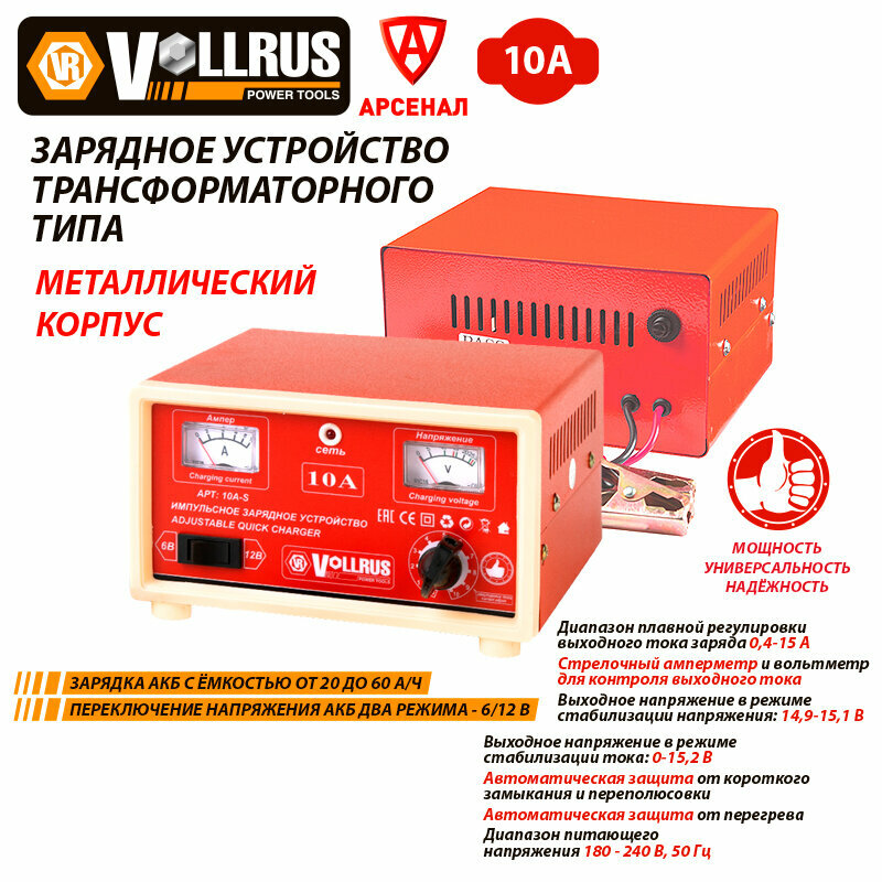 Зарядное Устройство Vollrus 10А-S (Для Акб 20-60 А/Ч) VOLLRUS арт. VLR10AS интересное:
