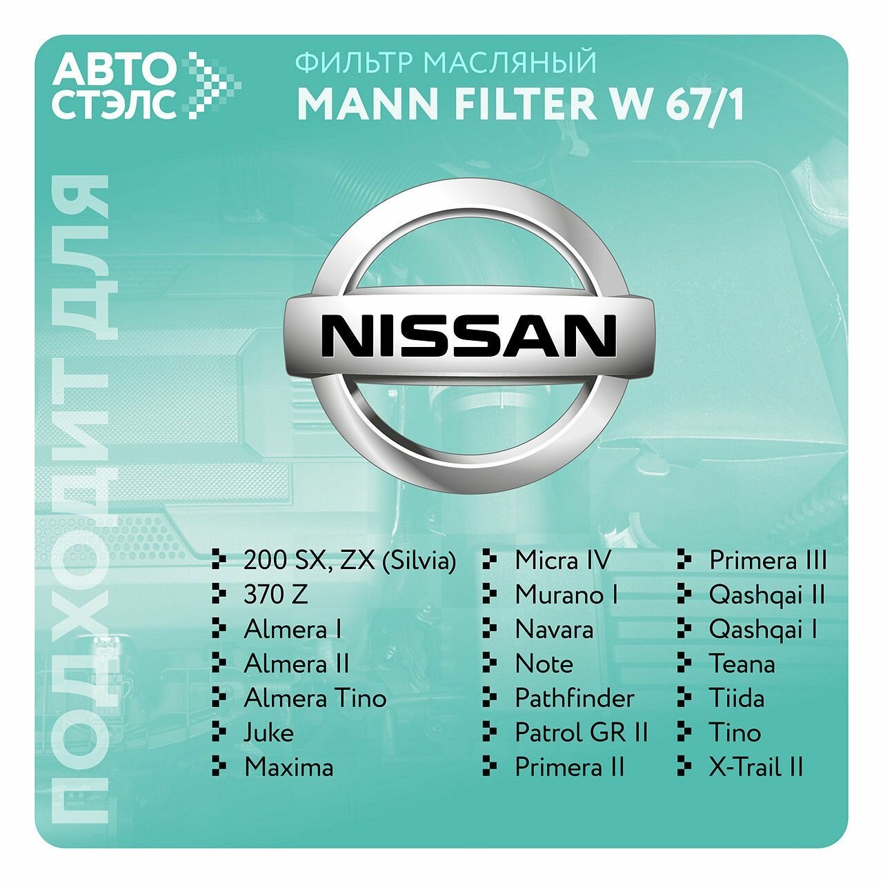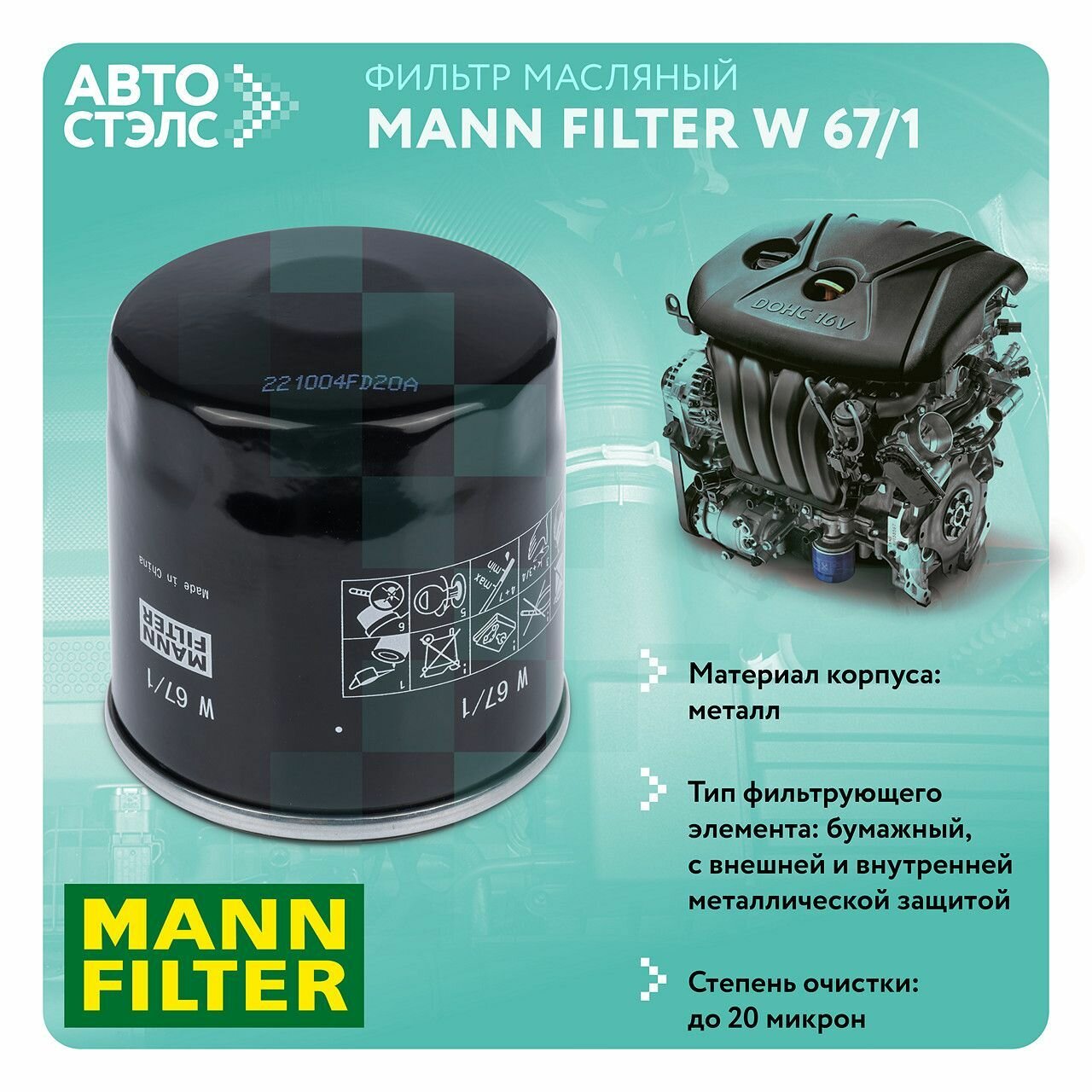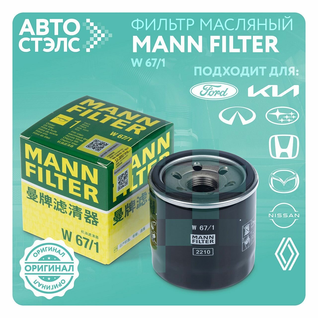 Фильтр масляный масляный фильтр MANN FILTER / OPEL NISSAN MAZDA MITSUBISHI KIA. OEM: W67/1. Киа Опел Рено Мазда Ниссан интересное: