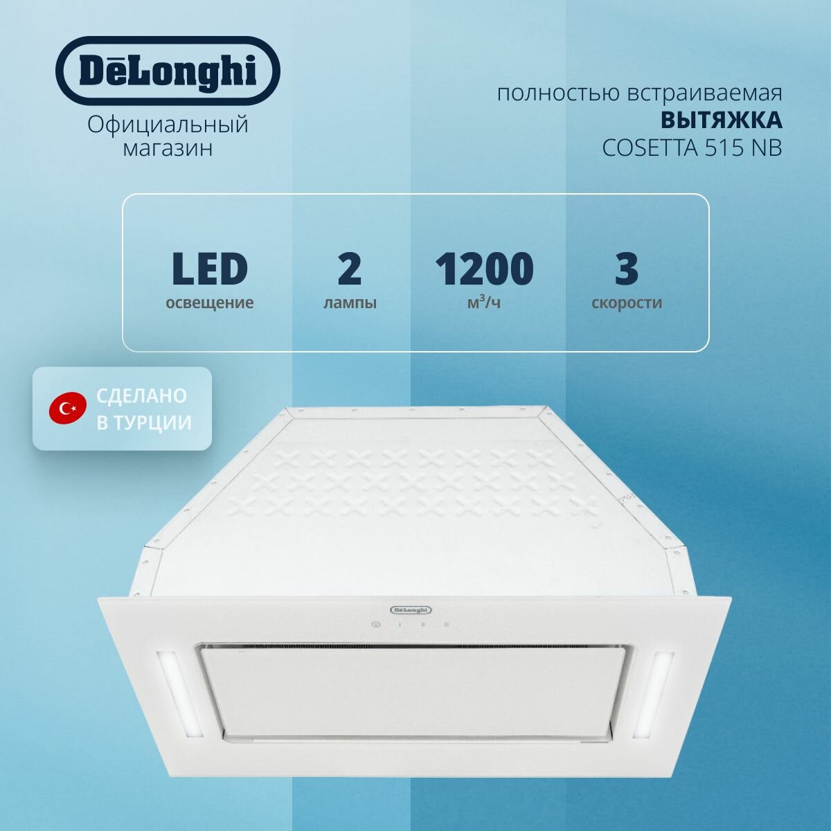 Кухонная вытяжка DeLonghi COSETTA 515 BB, полностью встраиваемая, 52 см, белая, 3 скорости, 1200 м3/ч, сенсорное управление