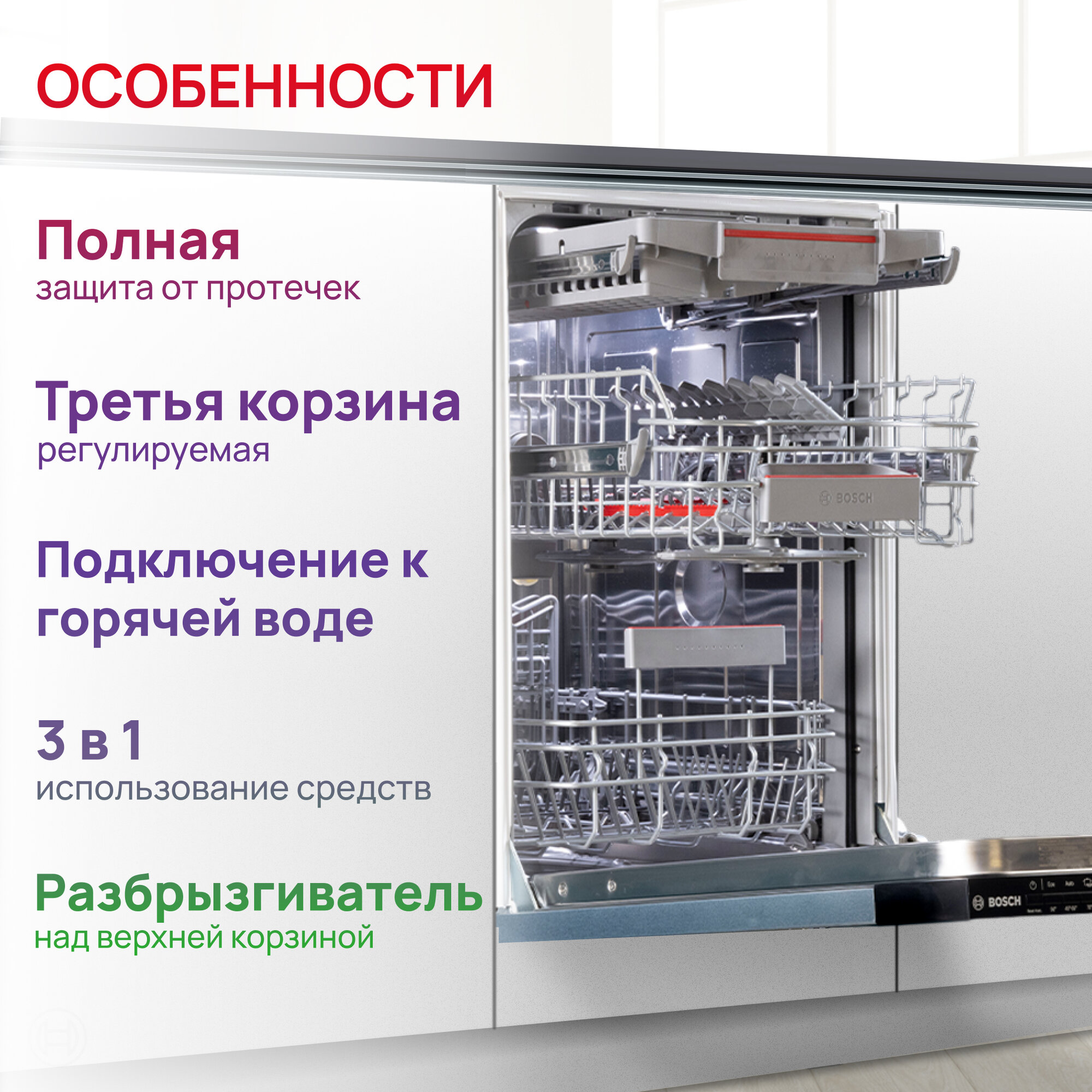 | Особенности конструкции | внутренняя поверхность из нержавеющей стали / дисплей / использование средств 3 в 1 / регулируемая по высоте корзина для посуды / сенсор чистоты воды / таймер отсрочки |