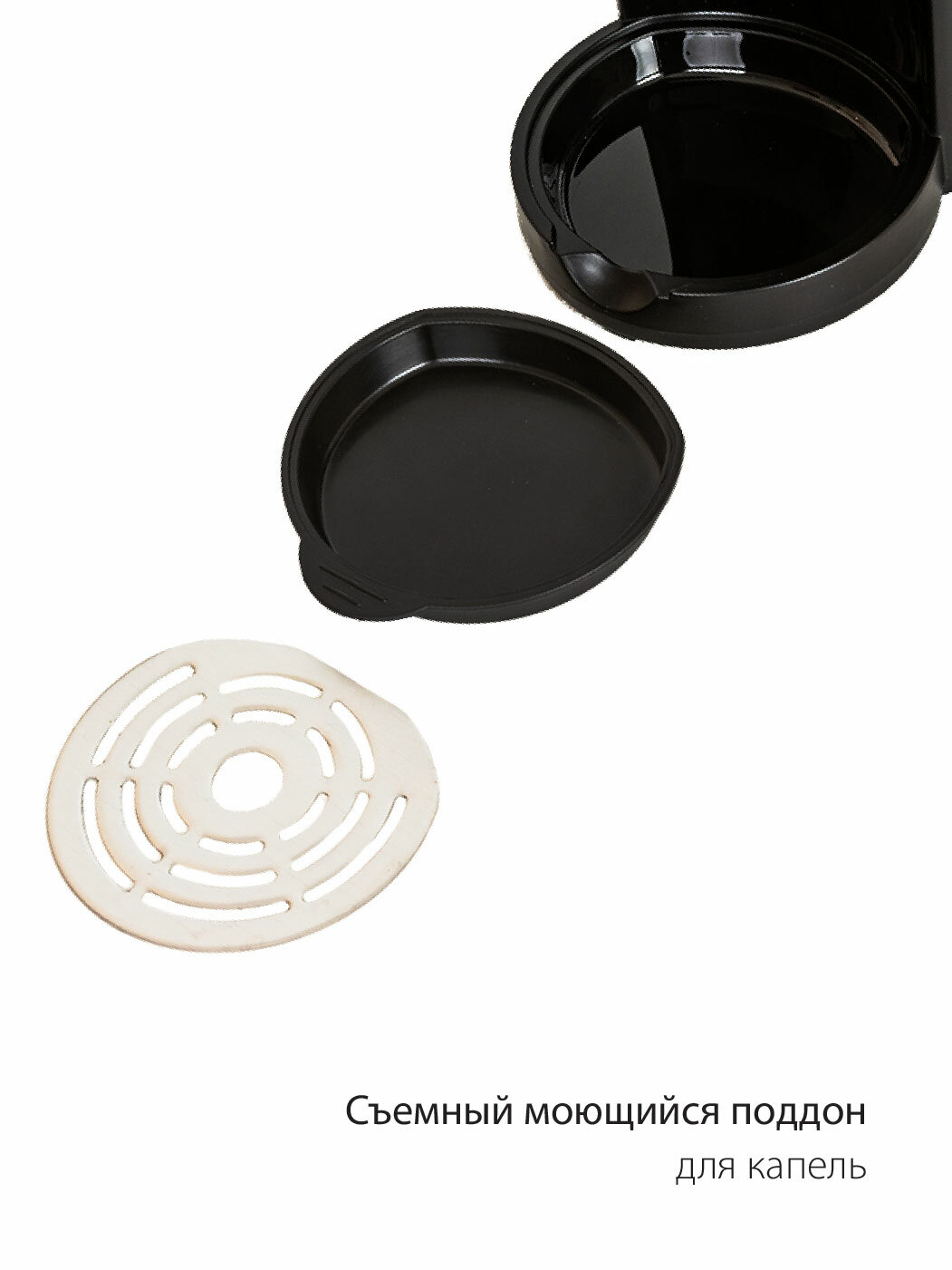 | Особенности конструкции | индикатор включения / индикатор уровня воды / индикация отсутствия кофе / индикация работы / съемный лоток для сбора капель |