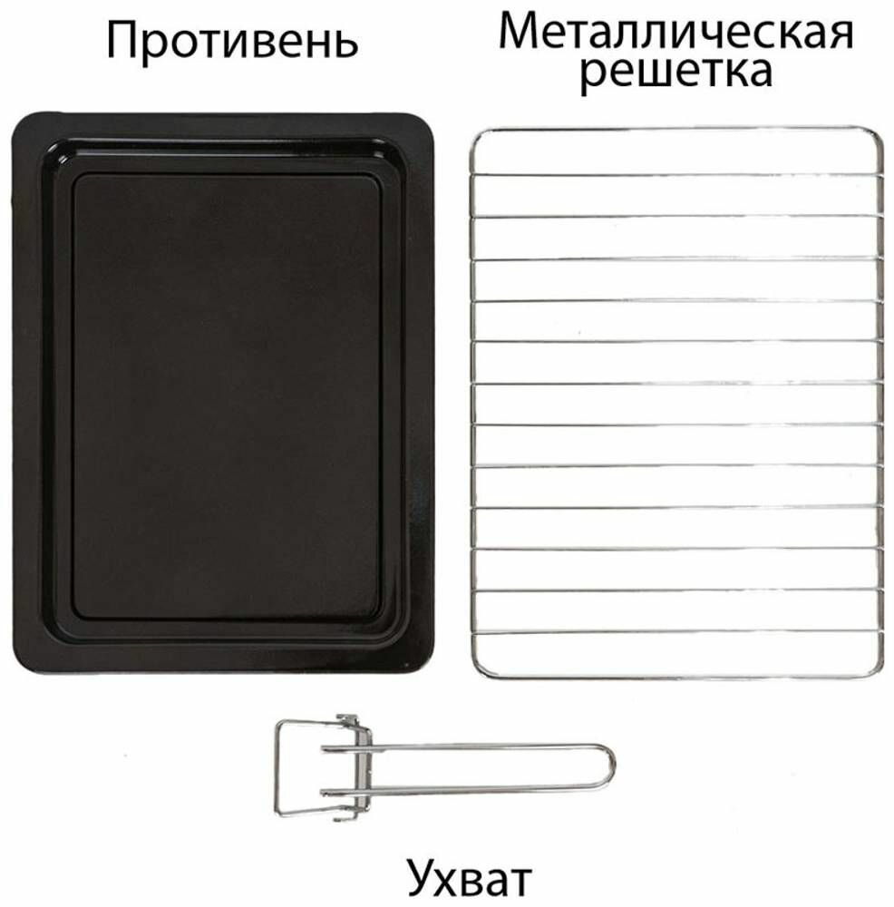 | Дополнительная информация | индикация включения, звуковой сигнал, индикация режима работы, встроенное освещение, мощность гриля - 1600 вт, тип гриля - ТЭН (верхний/нижний), стекло дверцы духовки - жаростойкое, количество нагревательных элементов - 2 шт, количество программ - 5 штдлина сетевого шнура - 0,89 м, открытие дверцы - вниз, материал фронтальной панели - металл/ пластик/ стекло, материал корпуса - металл |