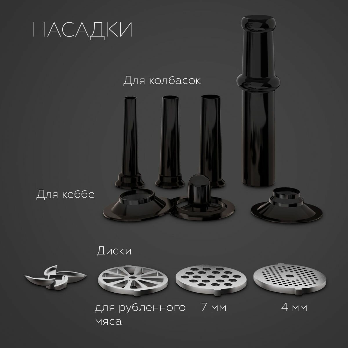 | Насадки | диск для фарша / насадка для кеббе / насадка для приготовления колбас / насадка для шинковки |