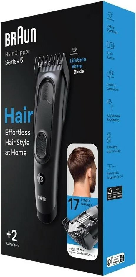 Машинка для стрижки волос Braun HC5330, нержавеющая сталь, время работы до 50 минут