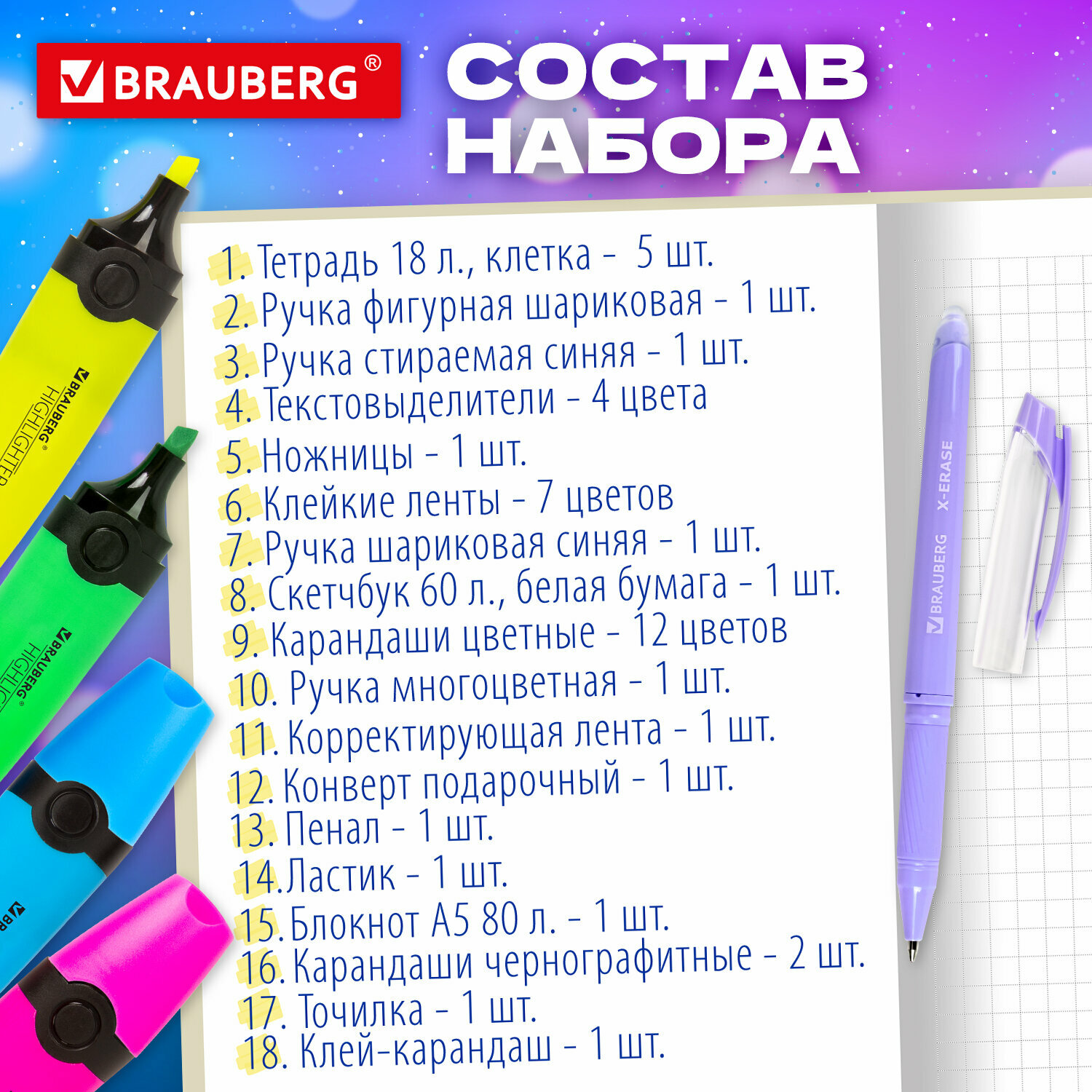 | В комплекте | блокнот, закладка, карандаш, клей-карандаш, ластик, маркер, ножницы, пенал, ручка, скетчбук, скотч, тетрадь, точилка, фломастеры, цветные карандаши |