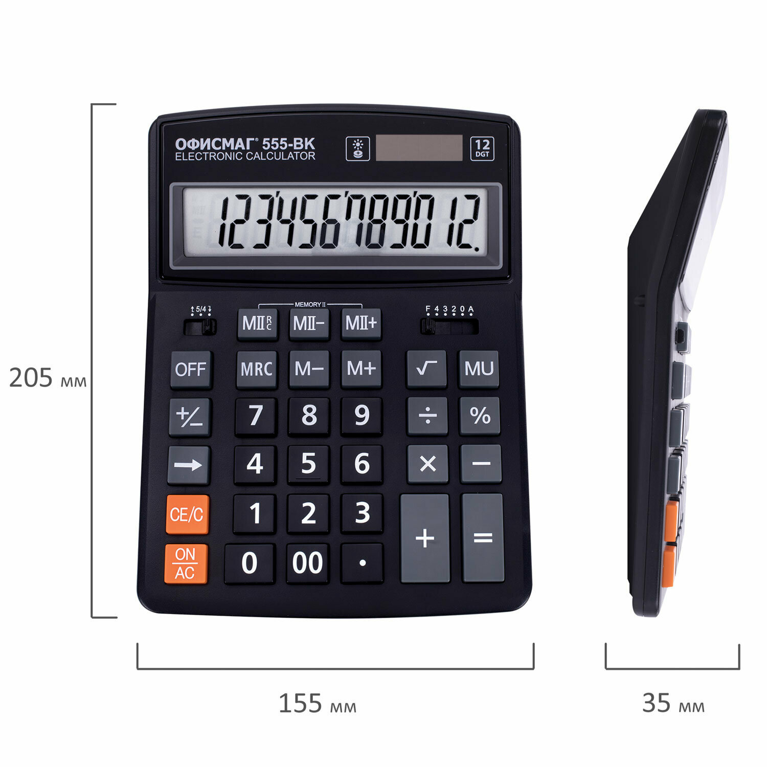 Калькулятор настольный большой 12 разрядный, 206x155 мм, двойное питание, черный, Офисмаг 555-BK, 271729 интересное: