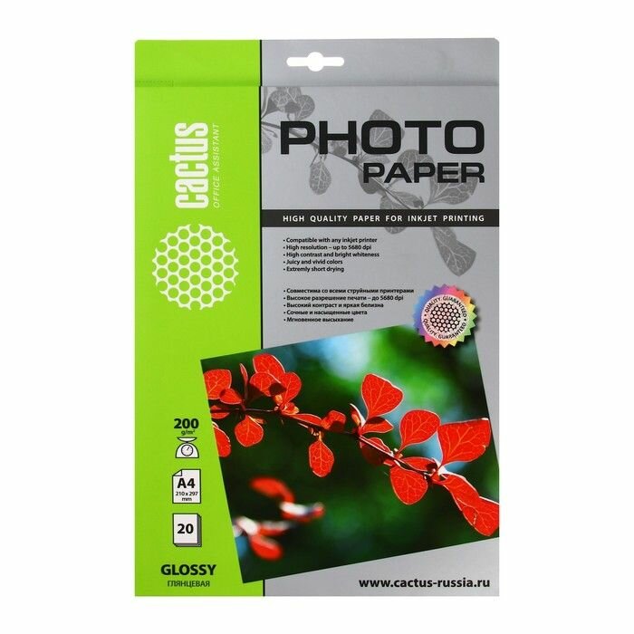 Фотобумага Cactus A4 глянцевая, 200г/м2, 20л, белая для струйной печати CS-GA420020