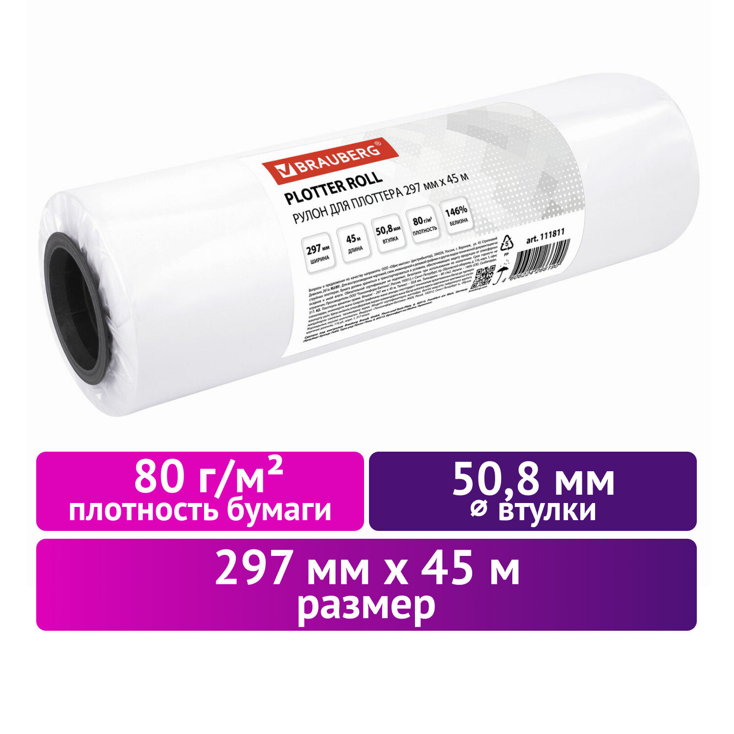 Купить Бумага для плоттера офисная / рулонная / для выкройки / рисования / печати 297 мм х 45 м х втулка 50,8 мм, 80 г/м2, белизна Cie 146%, Brauberg, 111811