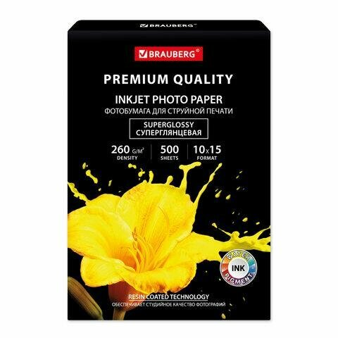 Купить Фотобумага супер глянцевая / бумага для печати фото на струйных принтерах Premium 10х15 см, 260 г/м2, односторонняя, 500 листов, Brauberg, 364000