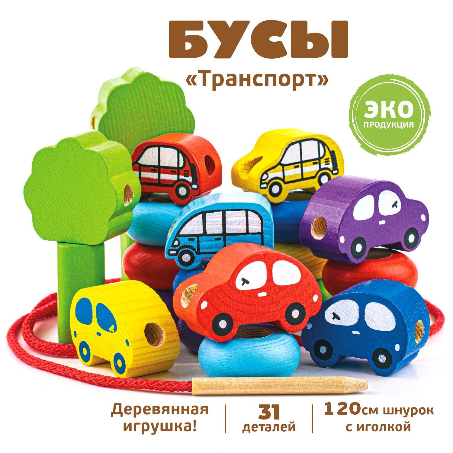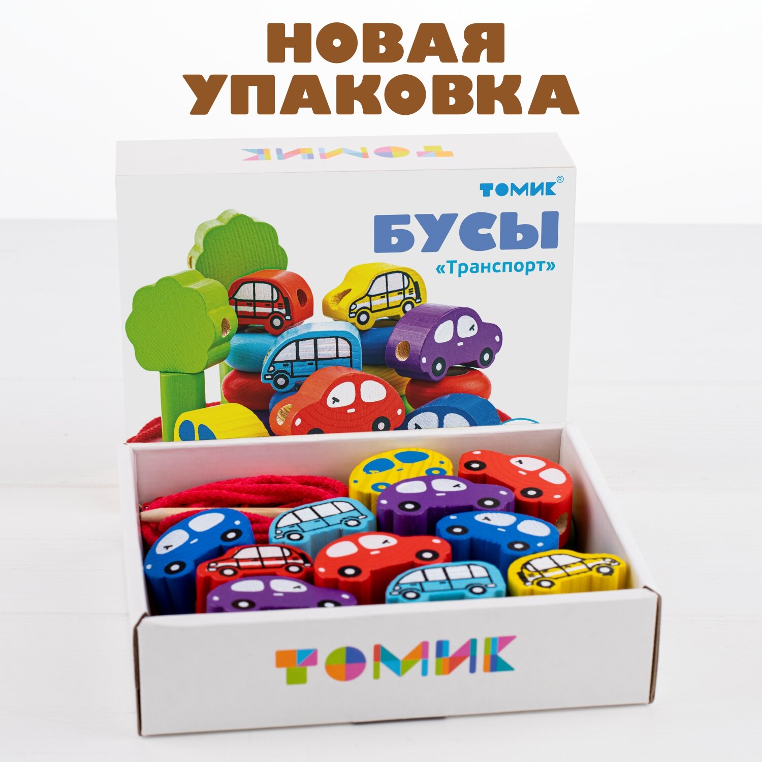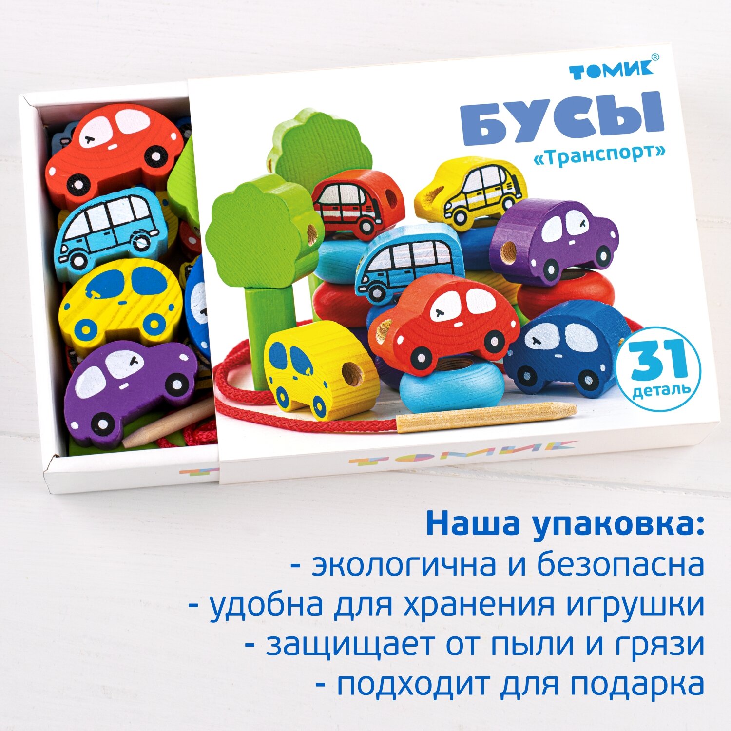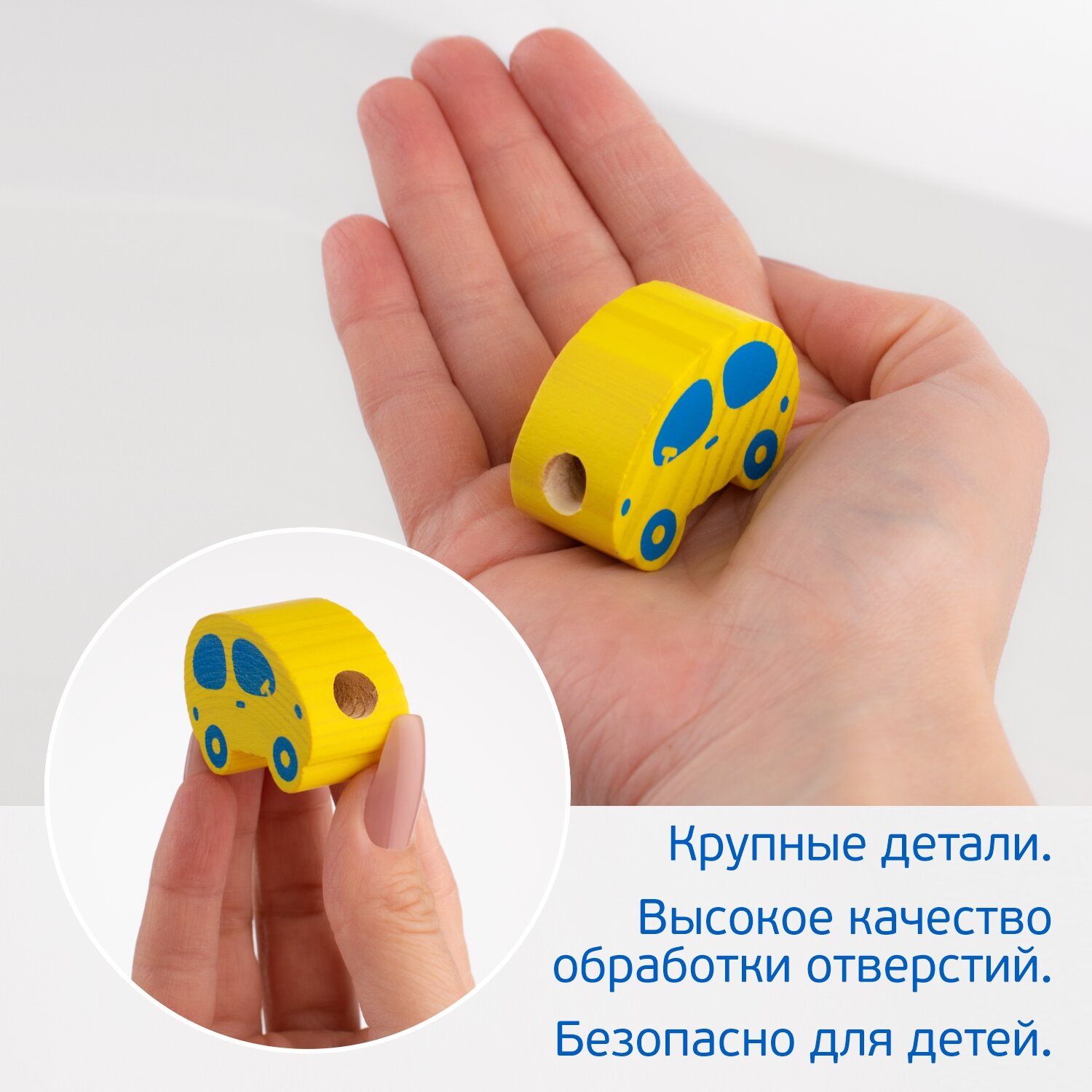 Развивающая игра-шнуровка Бусы "Транспорт", деревянная игрушка для развития мелкой моторики и навыка счета, 31 деталь