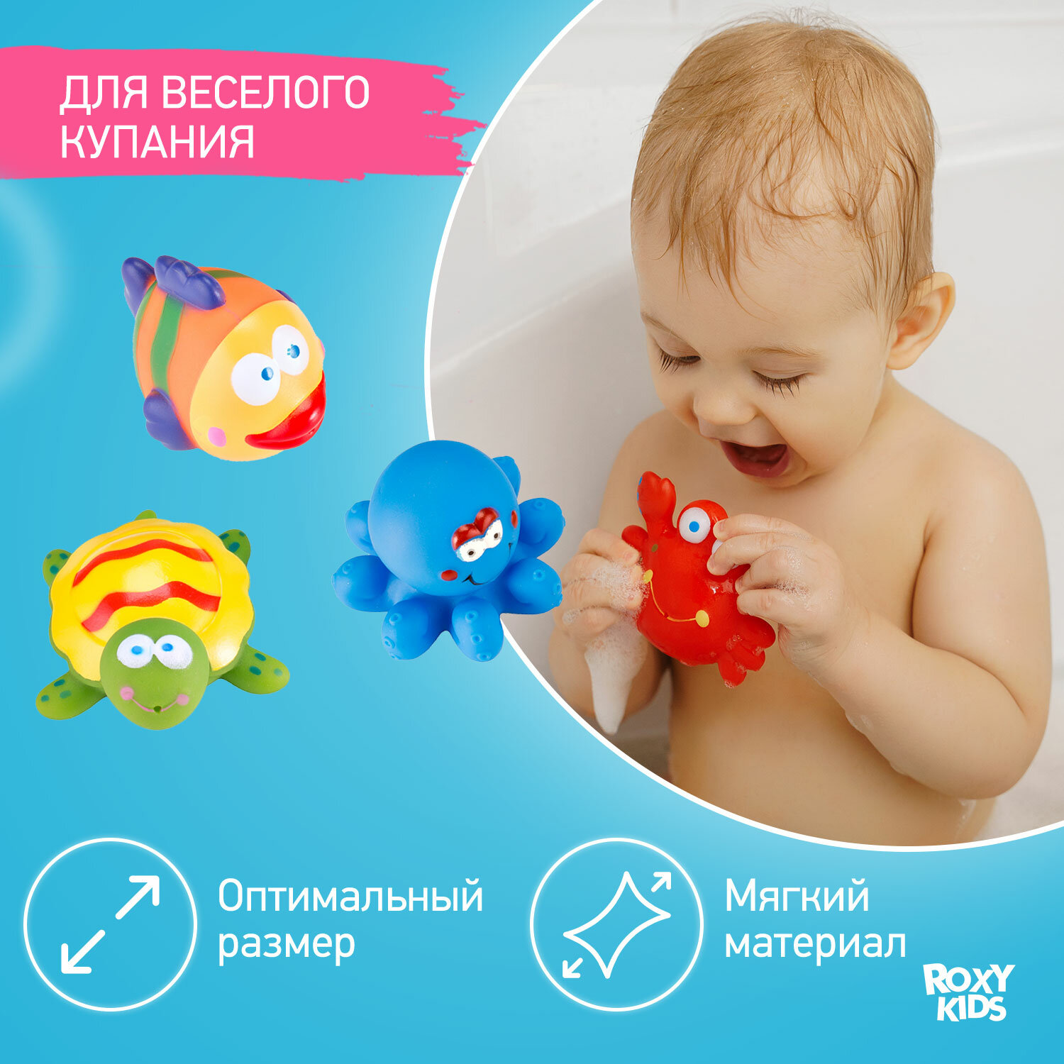 | Виды игрушек в комплекте | крабик, осьминог, рыбка, черепашка |