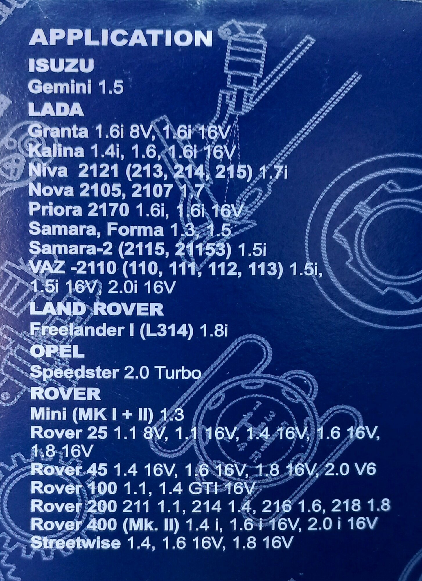 | Модель автомобиля | Chevrolet Niva / Great Wall Safe / Isuzu Gemini / LADA 2101 / LADA 2105 / LADA 2108 / LADA 2110 Богдан / LADA 2112 / LADA 2121 / LADA Granta / LADA Kalina / LADA Priora / LADA Samara / Land Rover Freelander / Lotus Elise / Opel Speedster / Rover 100 / Rover 200 / Rover 25 / Rover 400 / Rover 45 / Rover MGF / Rover Mini / Rover Streetwise / Toyota Cressida / ИЖ 2126 / УАЗ-3163 |