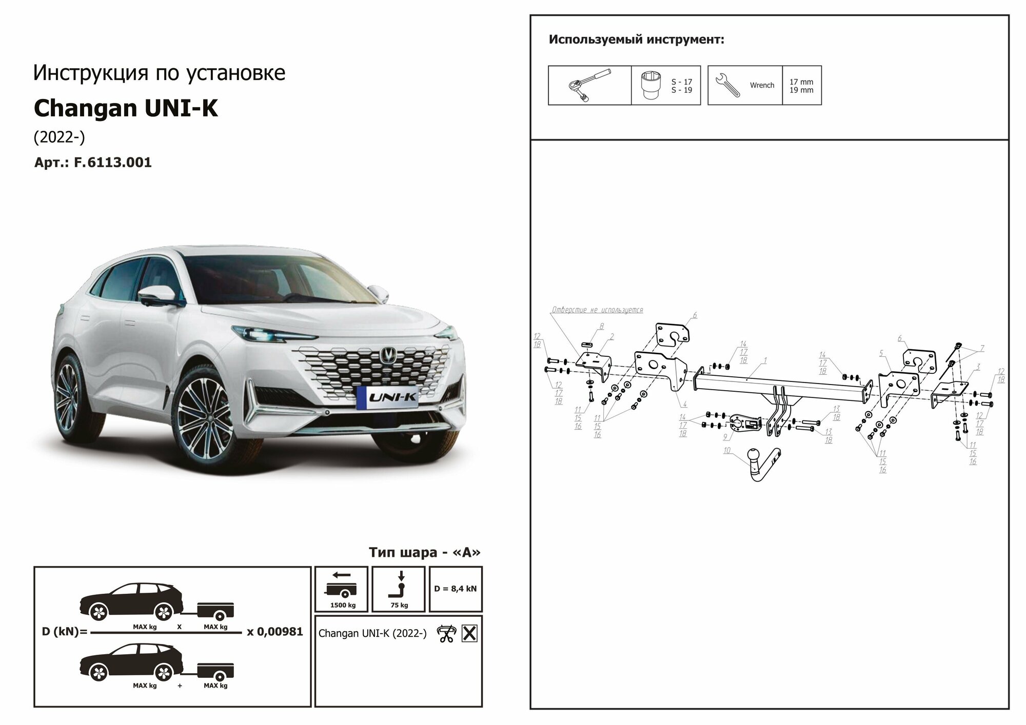 Фаркоп BERG Changan UNI-K (2022-), шар А, 1500/75 кг.