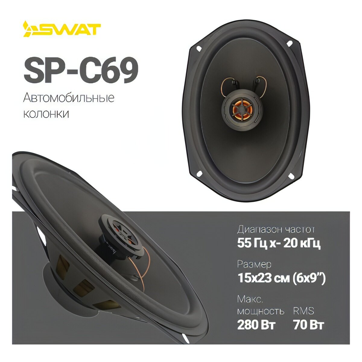| Дополнительная информация | Автомобильные колонки SWAT SP-C69 / 6*9", коакс., акустика 70/280 Вт. |