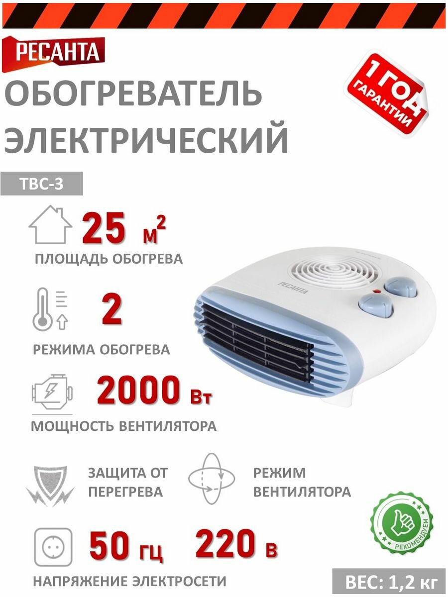 Тепловентилятор Ресанта ТВС-3, 2000Вт, с термостатом, 2 режима, белый [67/2/12] интересное:
