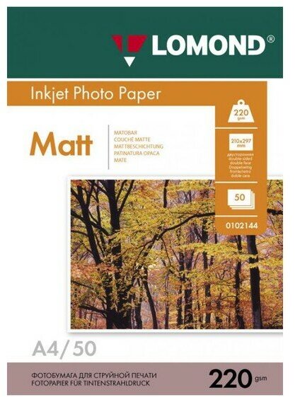 220 г/м, А4, Матовая двухсторонняя фотобумага, 50 листов Lomond 0102144