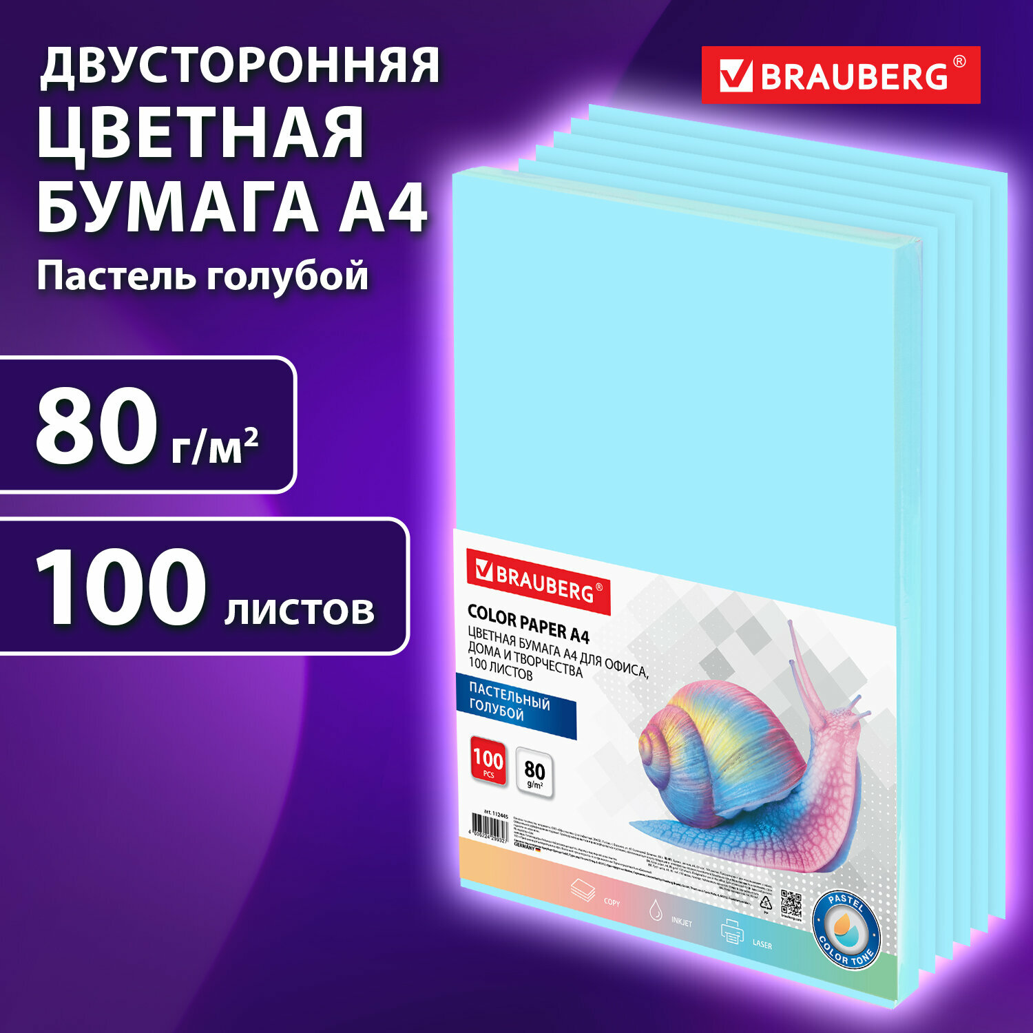 Бумага цветная BRAUBERG, А4, 80 г/м2, 100 л., пастель, голубая, для офисной техники, 112445