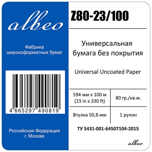 Рулонная бумага для плоттеров Albeo Z80-23/100 (0,594х100 м., 80 г/кв.м.)