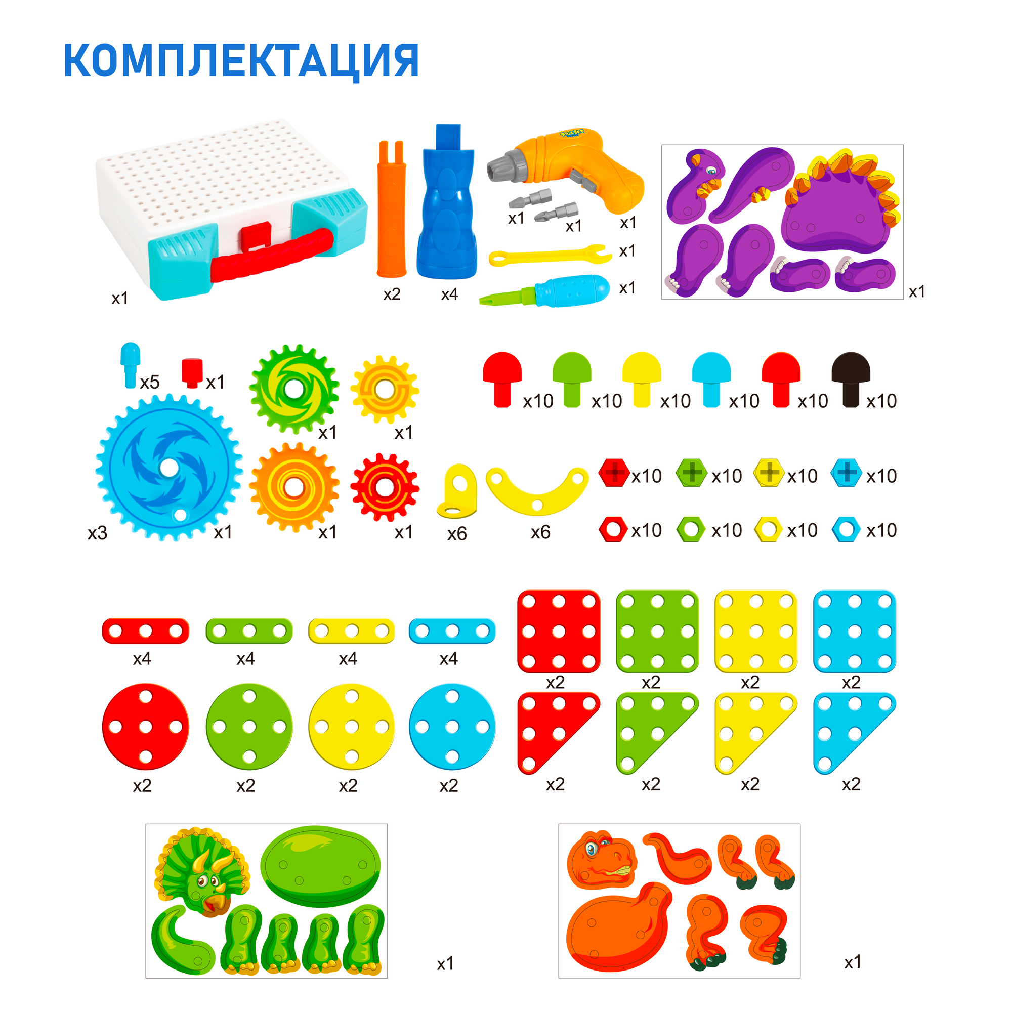 | Комплектация | чемодан, который легко трансформируется в рабочий столик, 3 карточки со строительной техникой, различные по цвету и форме пластиковые детали: шурупы (2.5см), гайки (1.2см), мозаика (2см), шестеренки (ср.размер 5.5см), геометрические фигуры (4.5см), инструкция, шуруповерт, отвертка, гаечный ключ |