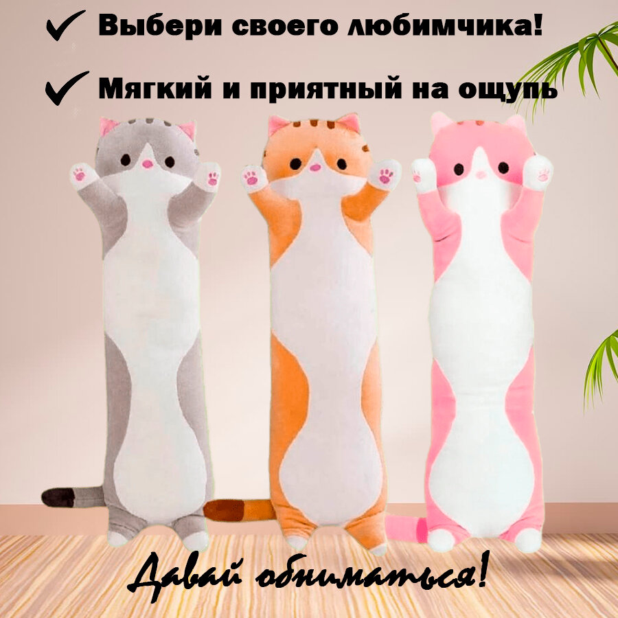Плюшевая кошка-обнимашка / подушка-антистресс / мягкая игрушка длинный кот-батон 50 см, розовый.