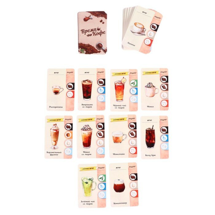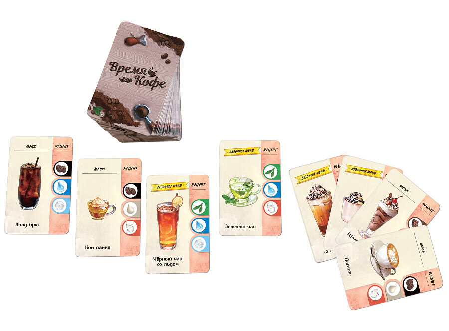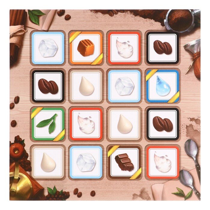 | Комплектация | Фишки ингредиентов – 102 шт. Планшеты игроков – 4 шт. Карточки заказов – 80 шт. Фишки чашек – 12 шт. Поле ингредиентов Жетоны – 32 шт. Фишки – 6 шт. Правила игры |