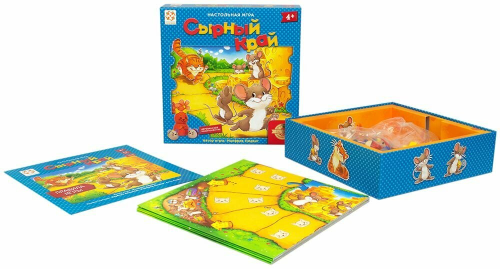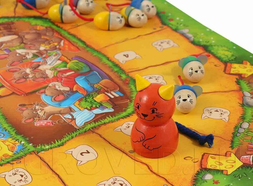 | Комплектация | - игровое поле; - фигурка кошки; - 18 мышат 4 цветов; - 20 кусочков сыра; - деревянный кубик; - правила игры |