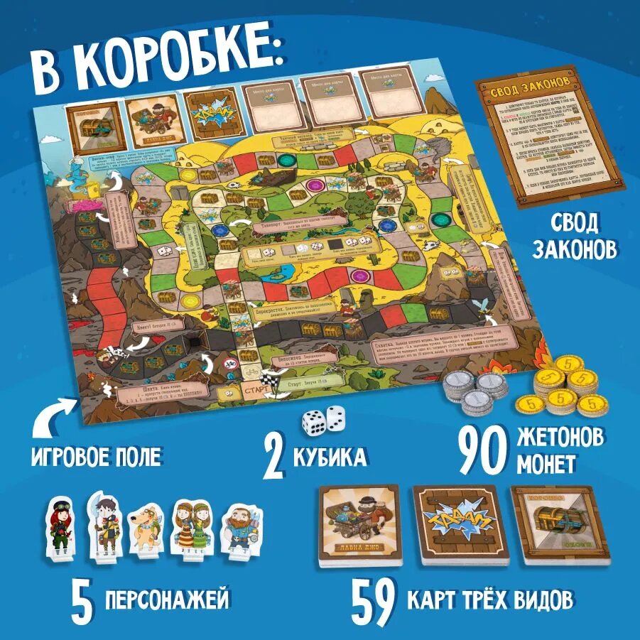 | Комплектация | игровое поле, 59 карт, 90 жетонов монет, 5 персонажей, 5 подставок под персонажей, 2 кубика, свод законов |