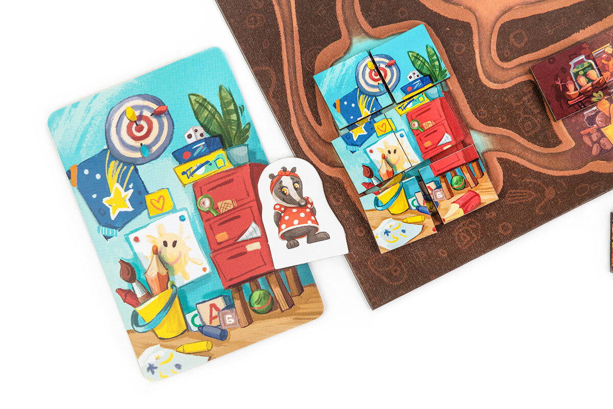 | Комплектация | 5 фигурок животных с подставками, 4 планшета героев, 4 части игрового поля, 30 жетонов леса трёх видов, 30 карточек заданий, правила игры |