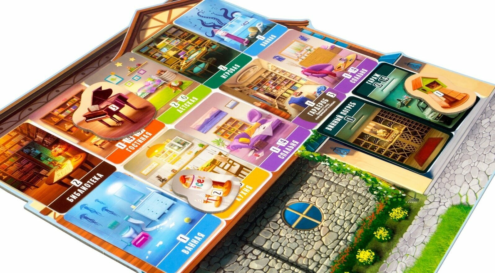 | Комплектация | игровой планшет, 4 планшета домов, 60 карт комнат, 28 карт крыш, 20 карт инструментов, обстановки и помощников, 11 жетонов обстановки, жетон первого игрока, 1 блокнот для подсчёта очков, 4 памятки, правила игры |