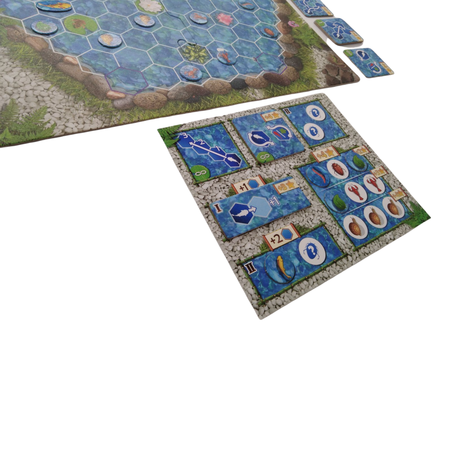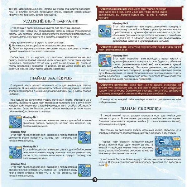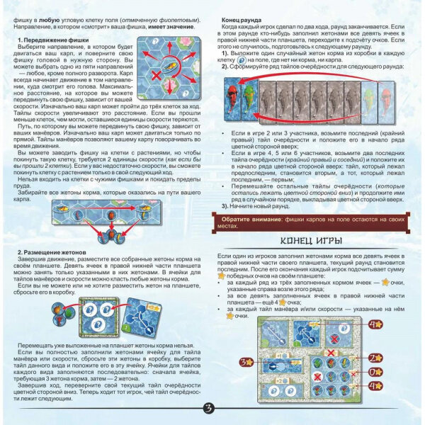 | Комплектация | Сборное поле из 4 частей; Карточки маневров – 35 шт.; Карточки скорости – 12 шт.; Жетоны кормов – 60 шт.; Жетоны карпов – 6 шт.; Планшеты игроков – 6 шт.; Карточки очередности хода – 12 шт.; Правила игры |