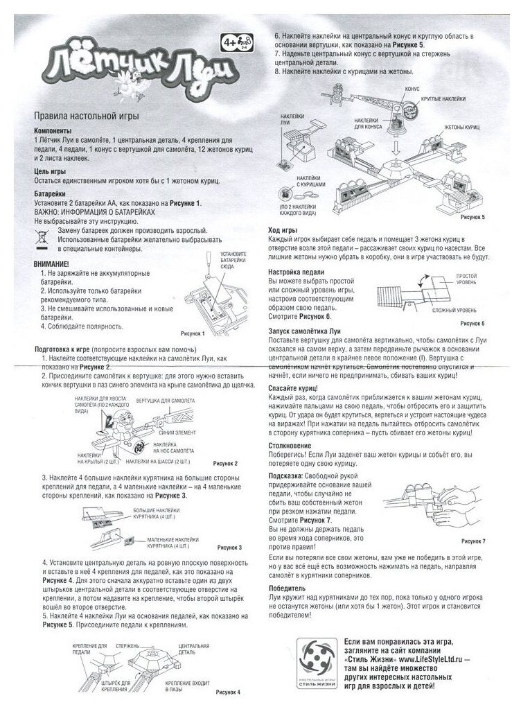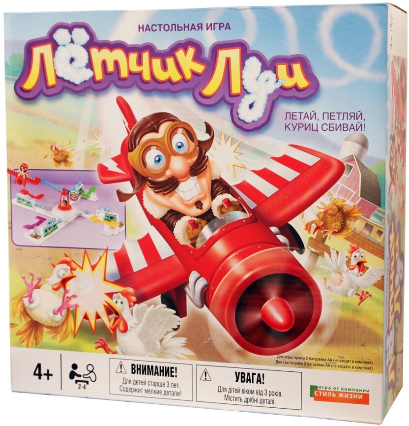 | Комплектация | 1 Лётчик Луи в самолёте, 1 центральная деталь, 4 крепления для педали, 4 педали, 1 конус с вертушкой для самолёта, 12 жетонов куриц, 2 листа наклеек, правила игры на русском языке |