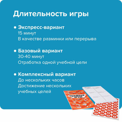 | Комплектация | 80 карт, 32 фишки, правила игры, методические указания для ведущего, набор чек-листов |