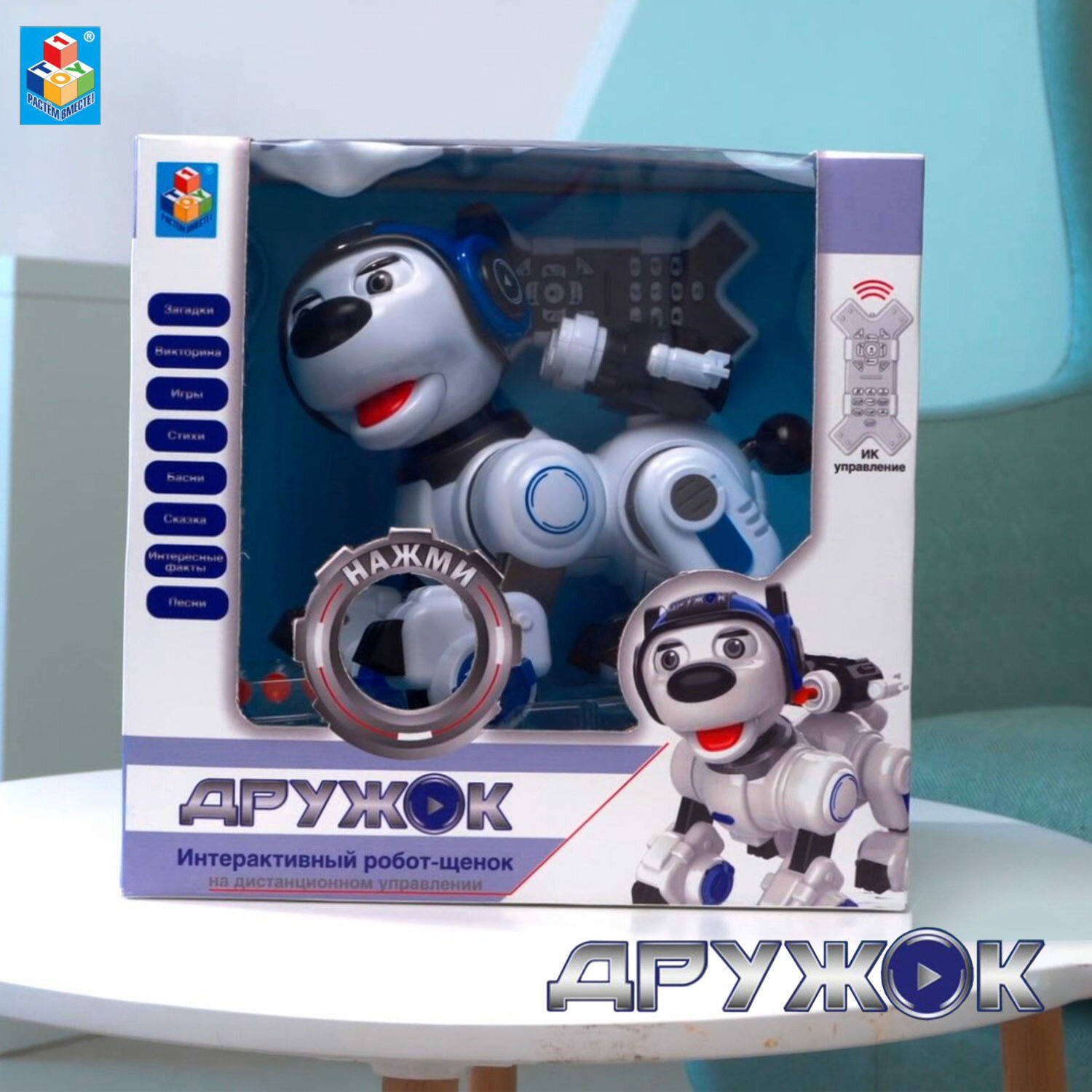 | Дополнительная информация | Функции игрушки: - загадывает 10 загадок - проводит образовательные викторины и интерактивные игры - читает 5 стихотворений, 2 басни, сказку - исполняет 3 песенки и рассказывает познавательные факты о собаках - открывает и закрывает глаза - реагирует на прикосновения - поворачивает голову вправо и влево - умеет ходить вперед, назад и поворачивать в разные стороны, танцевать Для работы пульта игрушки необходимы 2 батарейки ААА |