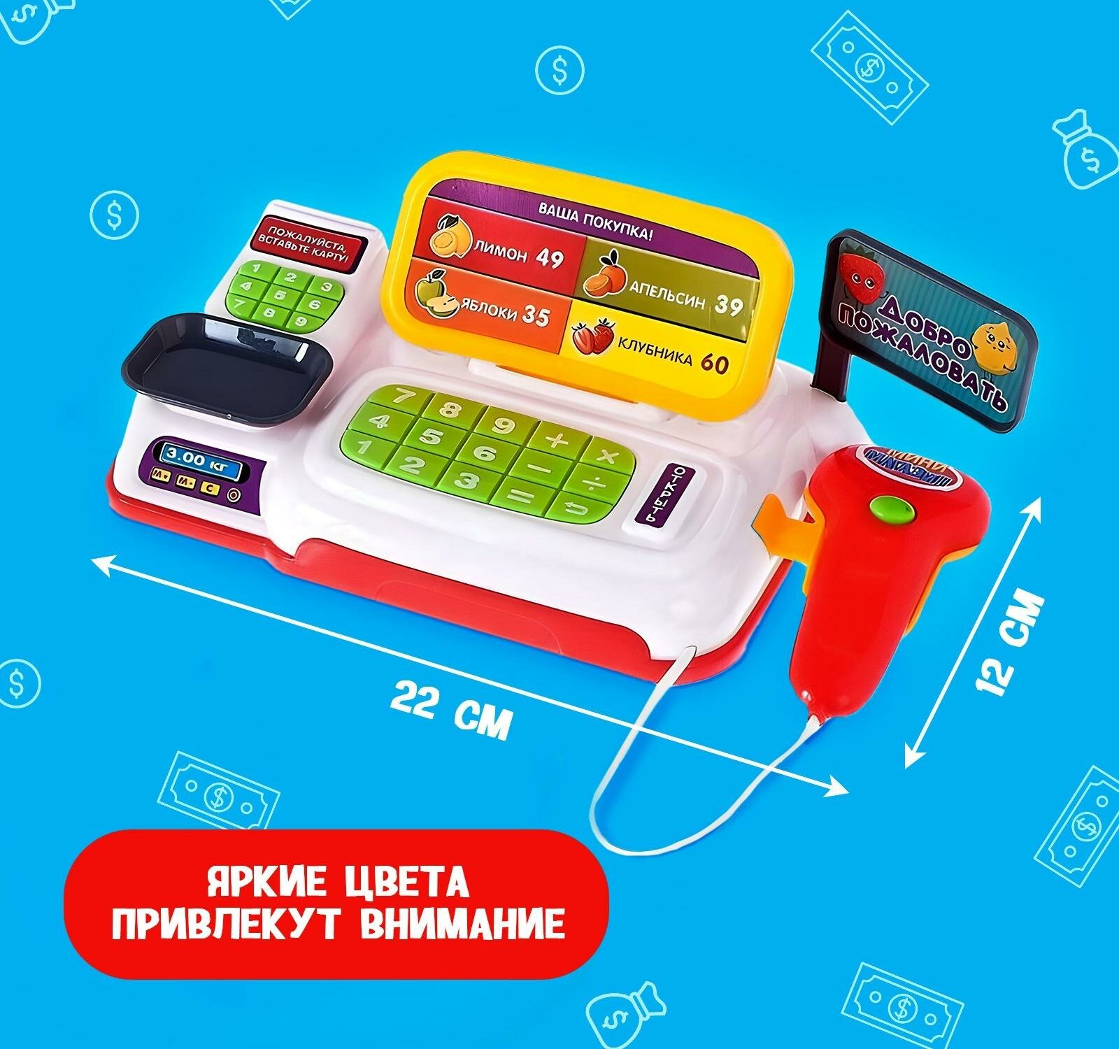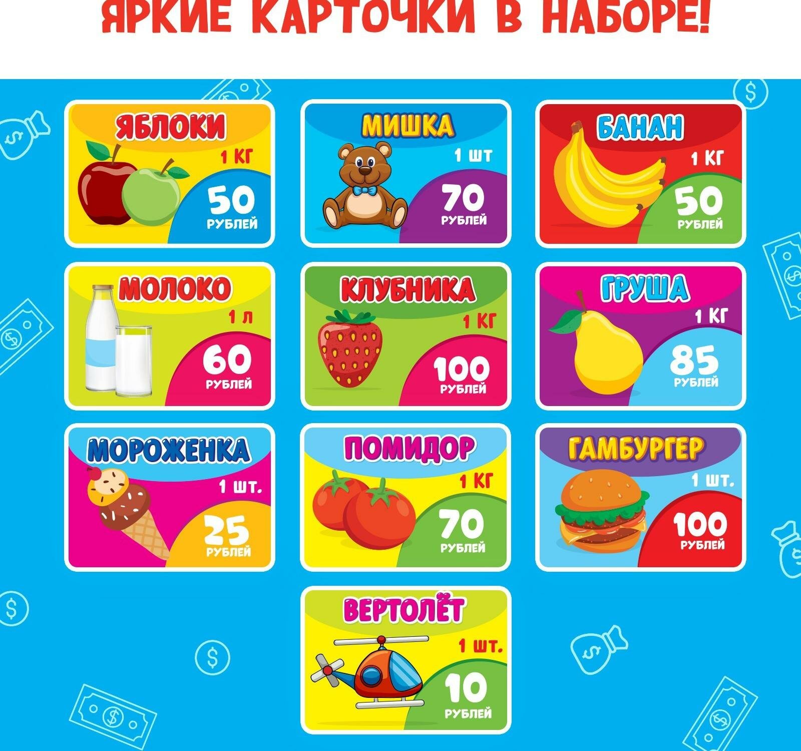 | В комплекте | банковская карта, деньги, калькулятор, кассовый аппарат, продукты, сканер |