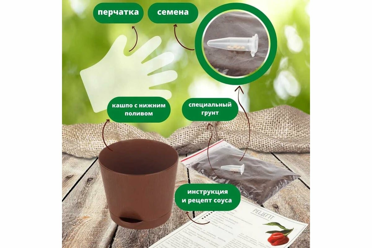 | Комплектация | земля, семена, горшок с системой прикорневого полива, перчатки, инструкция по сорту, рекомендации по посадке, рецепт уникального соуса |