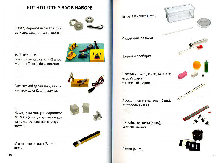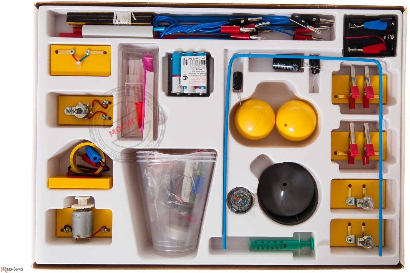 | Комплектация | батарейный блок; лампы; мотор с насадкой и шестерней; переменное сопротивление (резистор); диод; конденсаторы; катушка; компас; геркон; магнит и батарейки; универсальные зажимы; зажимы «крокодил»; провода; кювета; медная и цинковая пластины (электроды); проволочная стойка, сферы с осями, подставки; рабочее поле; пластиковые стаканы; стеклянная палочка, пластиковые трубочки, надувной шар; фольга, экраны, зажимы; пластиковые полосы, круги и квадраты; самоклеящиеся светофильтры и зеркальная полоса; пористый пластик, кусочек шкурки; индикаторная бумага; магнитные полосы, нить; рамки, засвеченная фотопленка, силовая кнопка; медный электрод, три вида проволоки; свеча, пластилин, зубочистки (палочки), кнопка; игла, шуруп, скрепки, изолента; трубочка с точками, шприц |