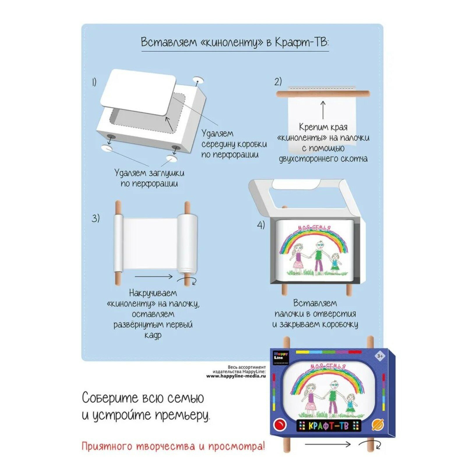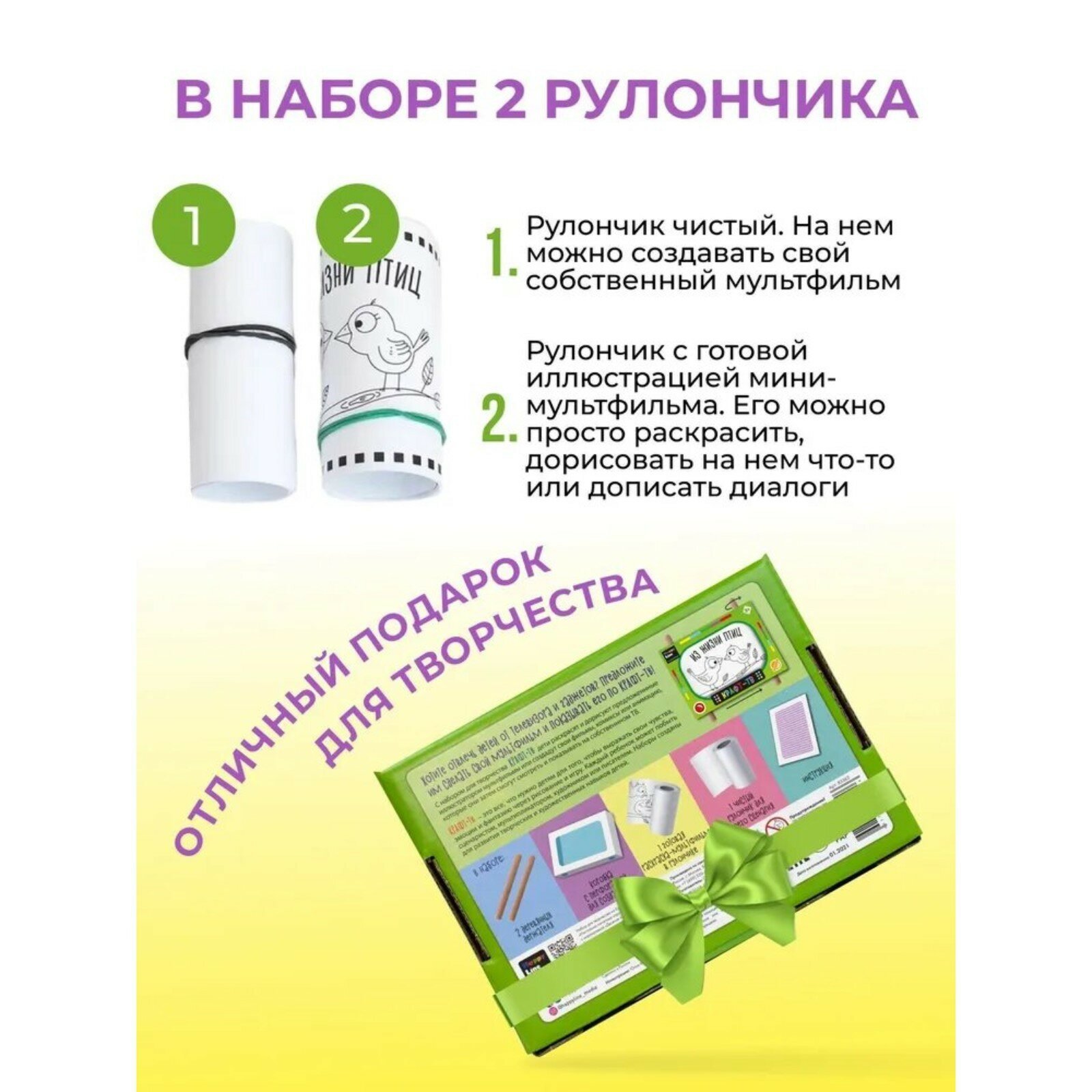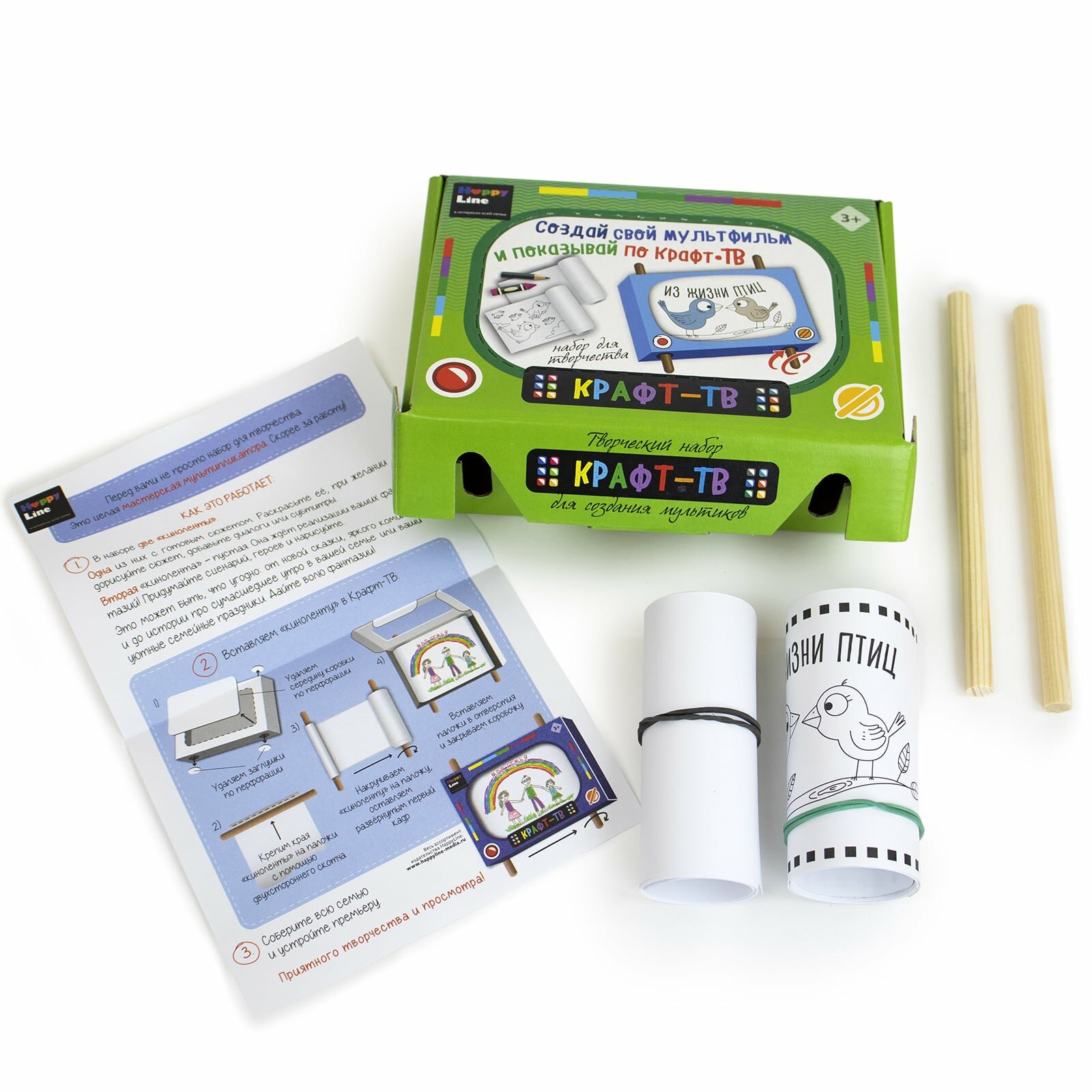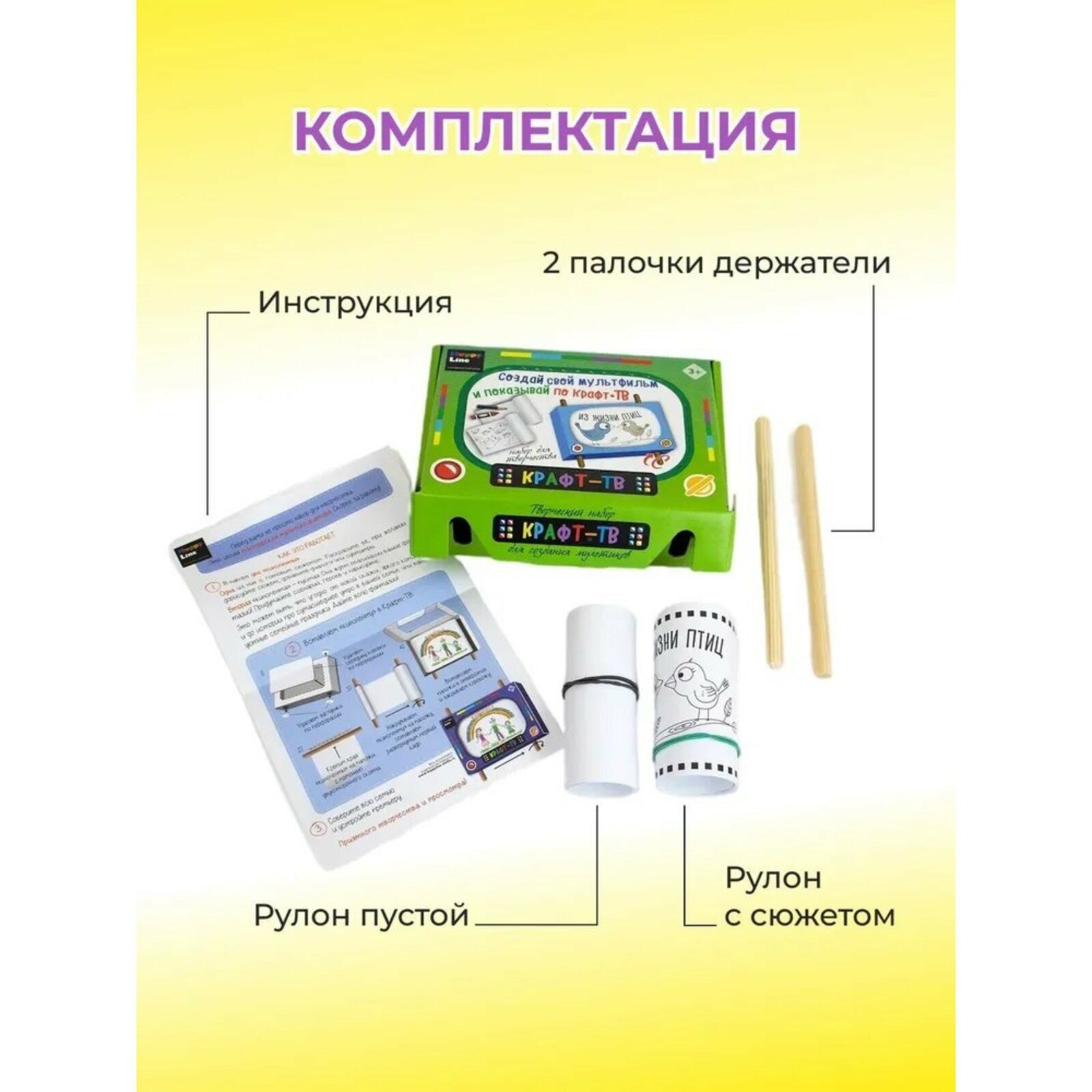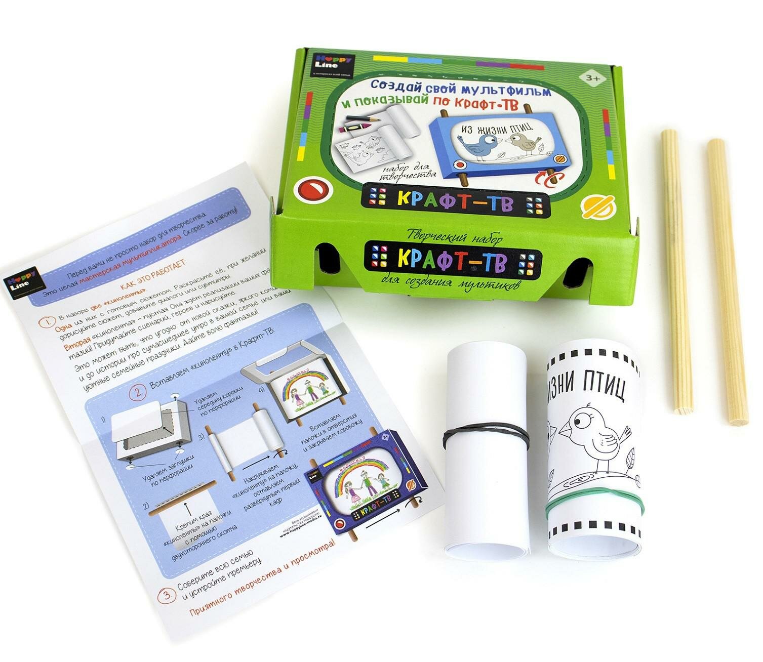 | Комплектация | коробка с перфорацией для создания ТВ (19 х 13 х 4 см), держатели деревянные – 2 шт. (длина – 18 см, диаметр – 1 см), рулончик с готовой раскраской-мультфильмом из 8 картинок – 1 шт. (1 м), рулончик чистый для своего сценария – 1 шт. (1 м), клейкая лента – 2 шт. (3 х 1 см), инструкция |