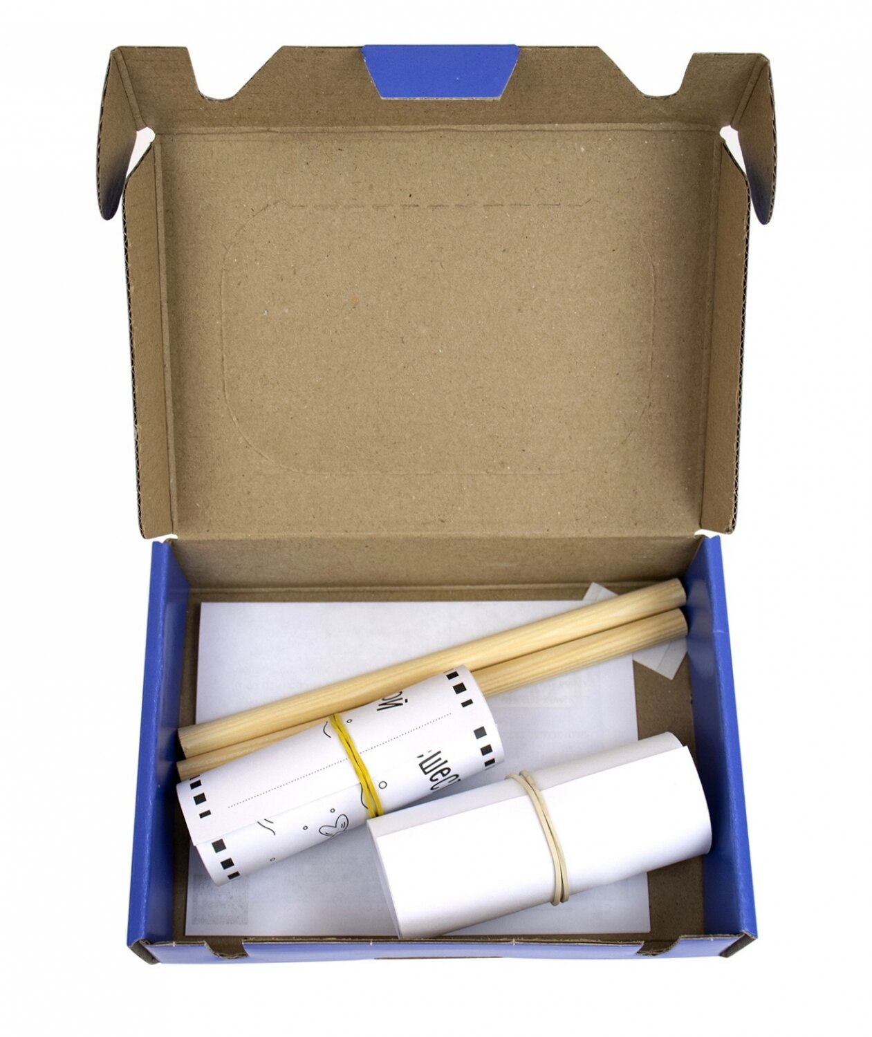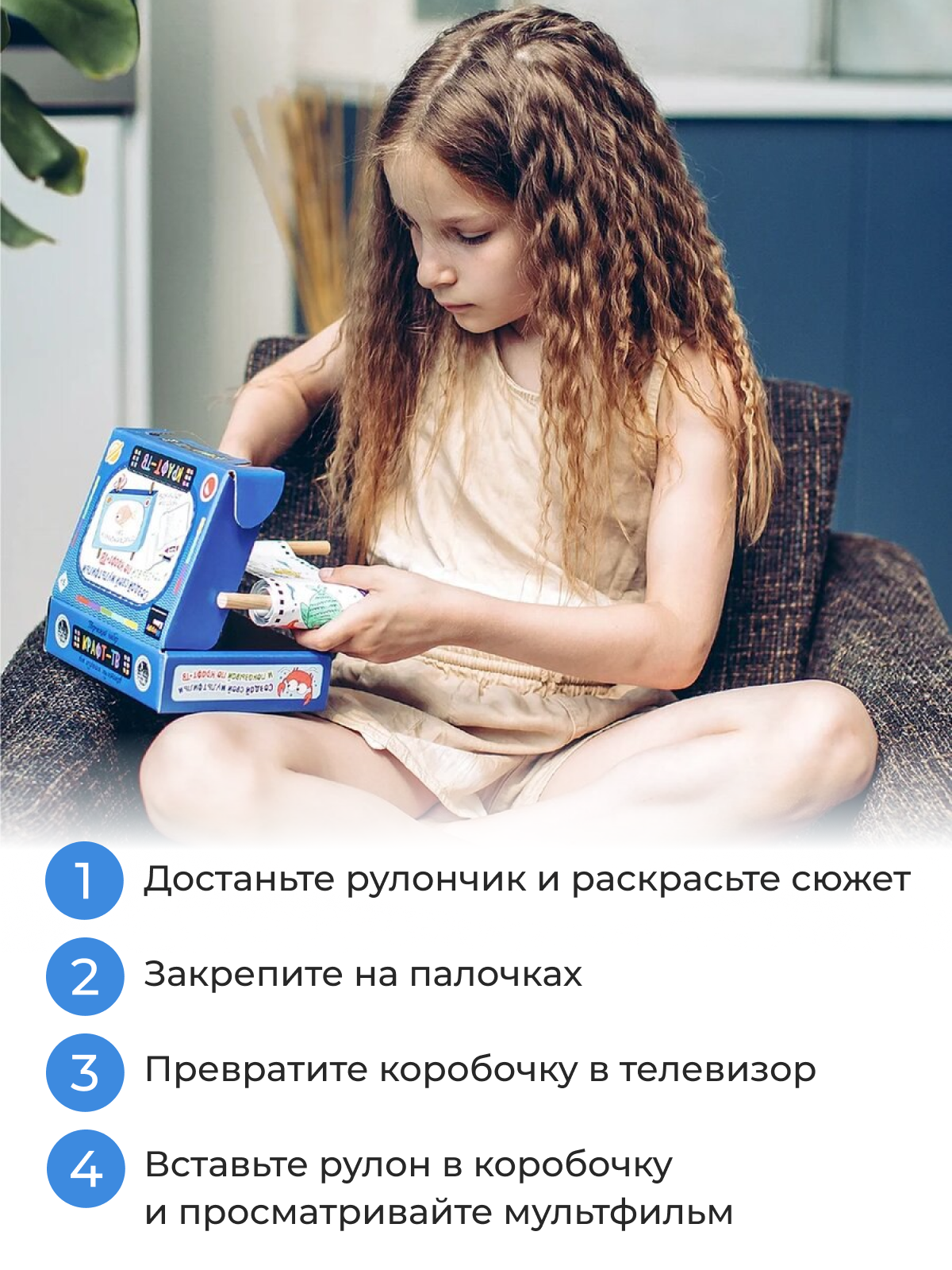 | Комплектация | коробка с перфорацией для создания ТВ (19 х 13 х 4 см), держатели деревянные – 2 шт. (длина – 18 см, диаметр – 1 см), рулончик с готовой раскраской-мультфильмом из 8 картинок – 1 шт. (1 м), рулончик чистый для своего сценария – 1 шт. (1 м), клейкая лента – 2 шт. (3 х 1 см), инструкция |