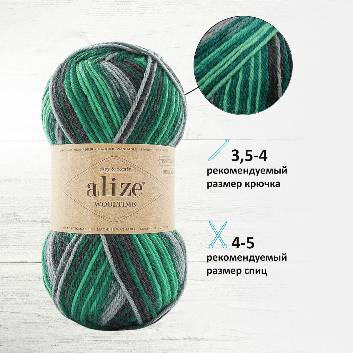 Пряжа Alize Wooltime принт черный-серый-зеленый-салатовый (11019), 75%шерсть/25%полиамид, 200м, 100г, 5шт