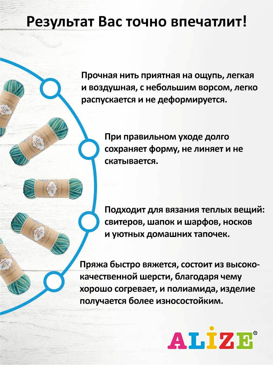 Пряжа SUPERWASH ARTISAN ALIZE, зел. бирюза принт - 9001, 75% SW шерсть, 25% полиамид, 5 мотков, 100 г, 420 м.