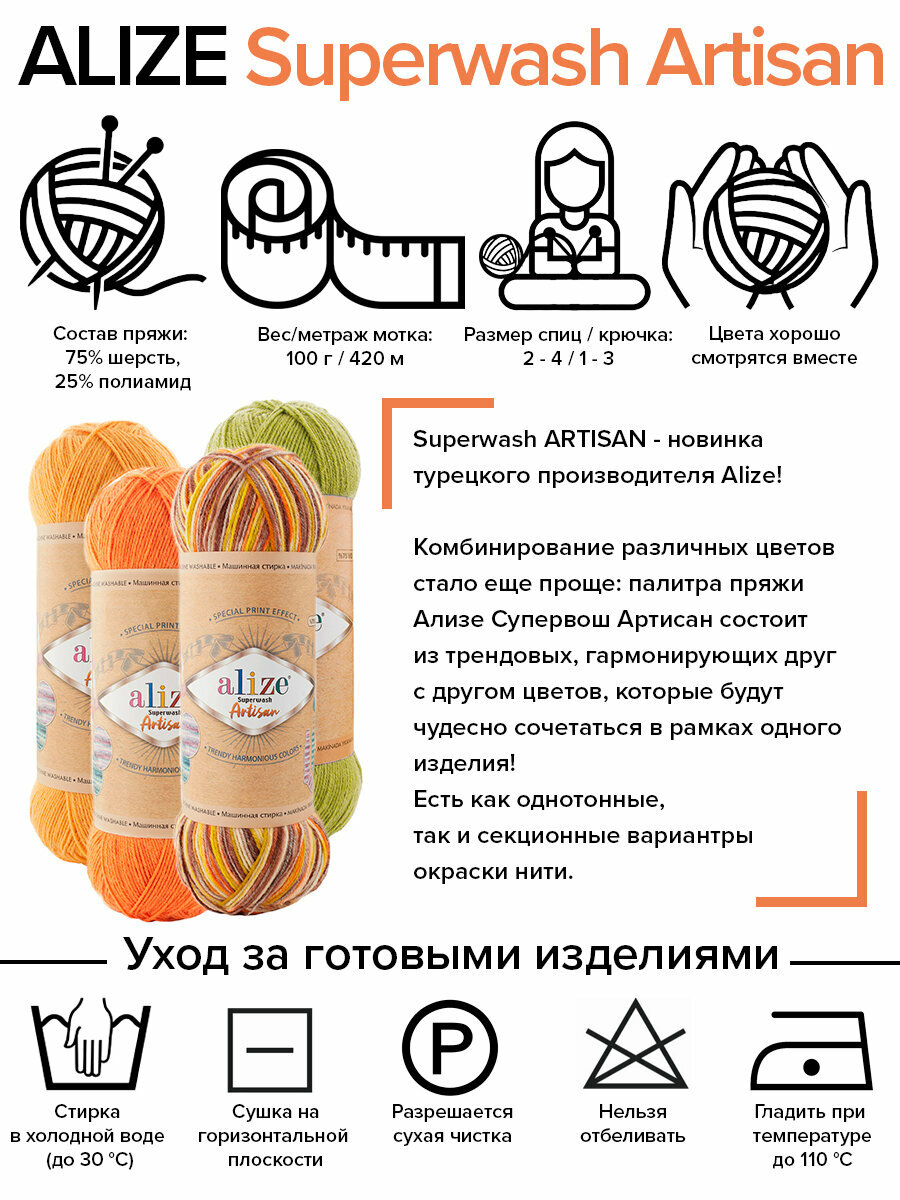 Пряжа Alize Superwash Artisan (Ализе Супервош Артизан) - 2 мотка, Коричневый, оранжевый, зеленый (9006), 75% шерсть супервош, 25% полиамид, 420м/100г