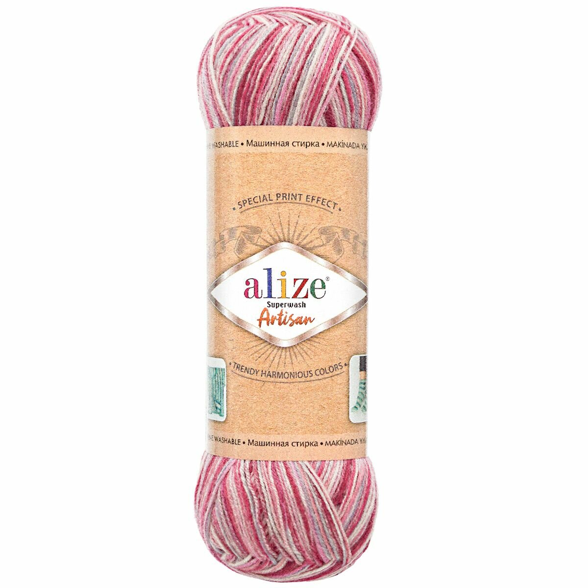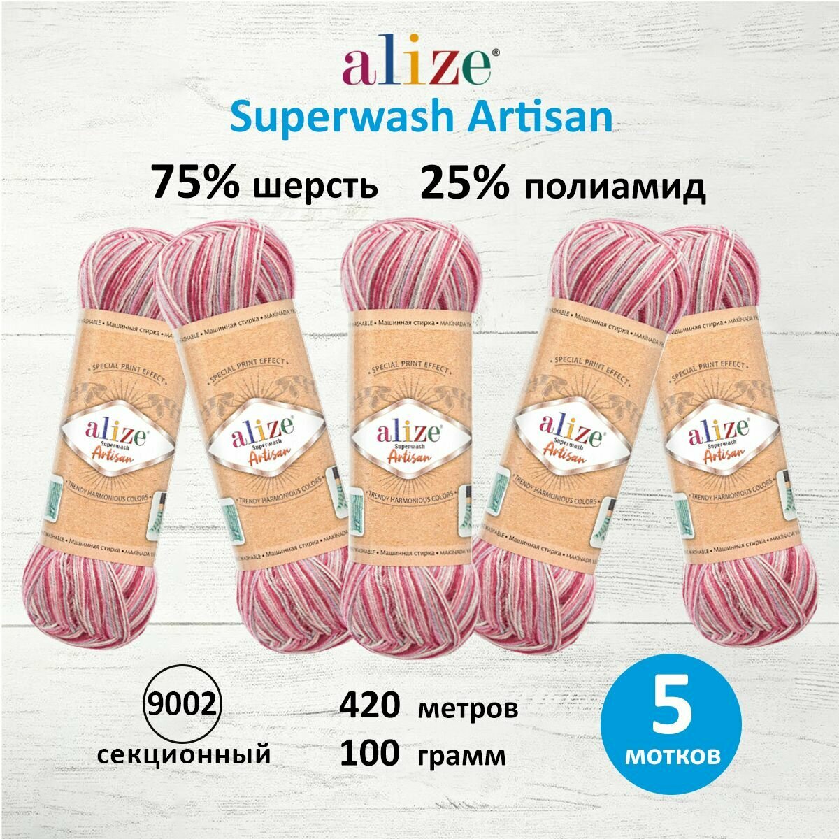 Пряжа SUPERWASH ARTISAN ALIZE, малиновый принт - 9002, 75% SW шерсть, 25% полиамид, 5 мотков, 100 г, 420 м.