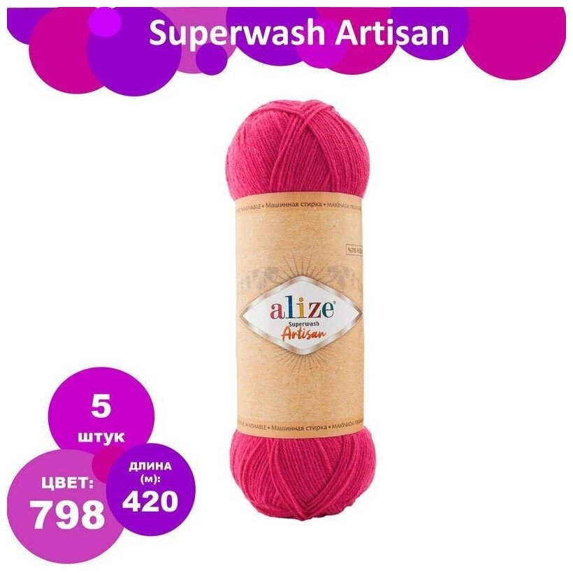 СохранитьПряжа для вязания ALIZE 'Superwash Artisan', 100г, 420м (75% SW шерсть, 25% полиамид) (798 фуксия), 5 мотков интересное: