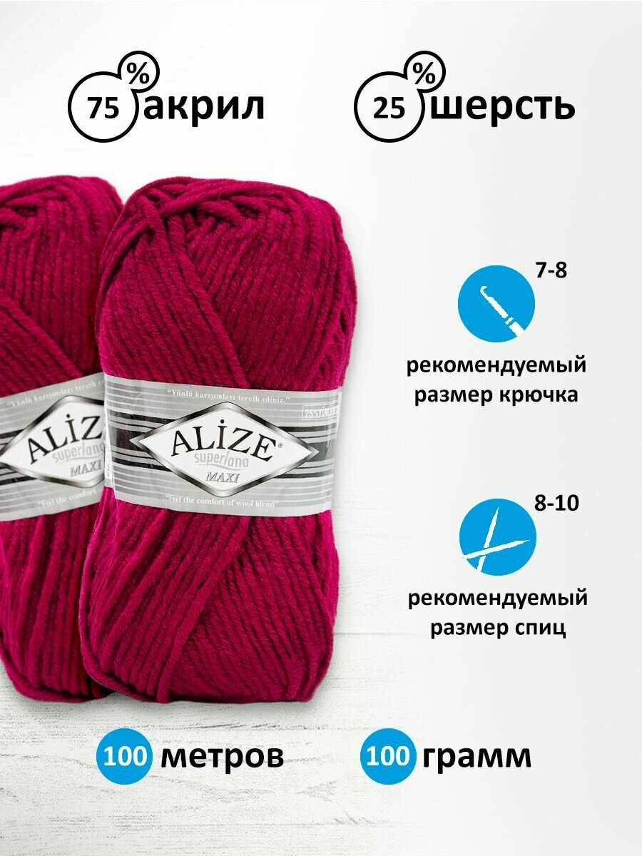 Пряжа ALIZE SUPERLANA MAXI, тем. фуксия - 209, 25% шерсть, 75% акрил, 5 мотков, 100 г, 100 м.