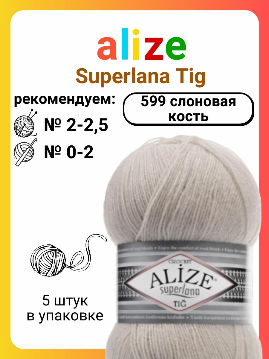 Купить Пряжа Alize Superlana Tig 599 слоновая кость, 100 г, 570 м, 5 штук