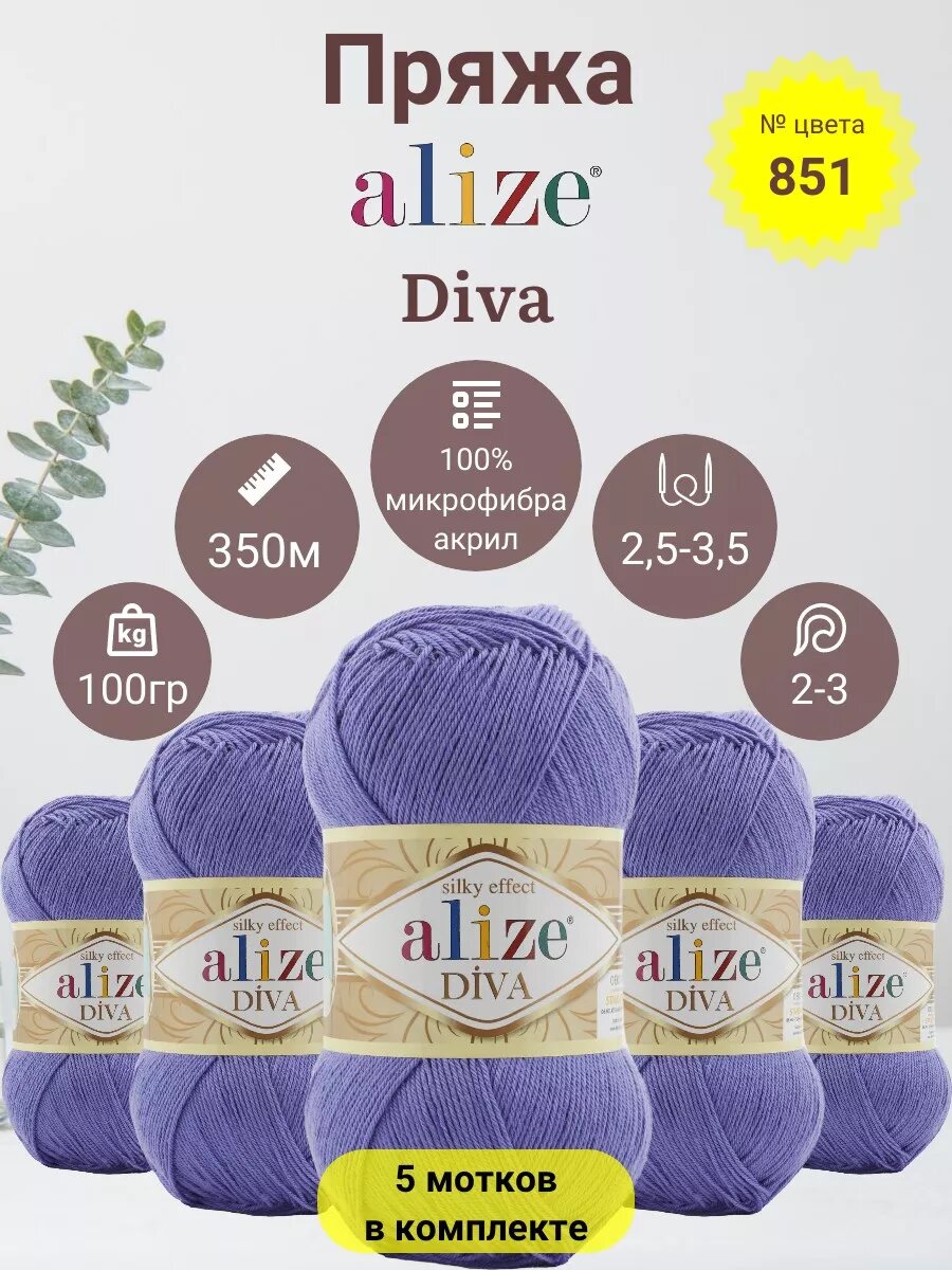 Пряжа ALIZE DIVA, тем. сиреневый - 851, 100% микрофибра акрил, 5 мотков, 100 г, 350 м.